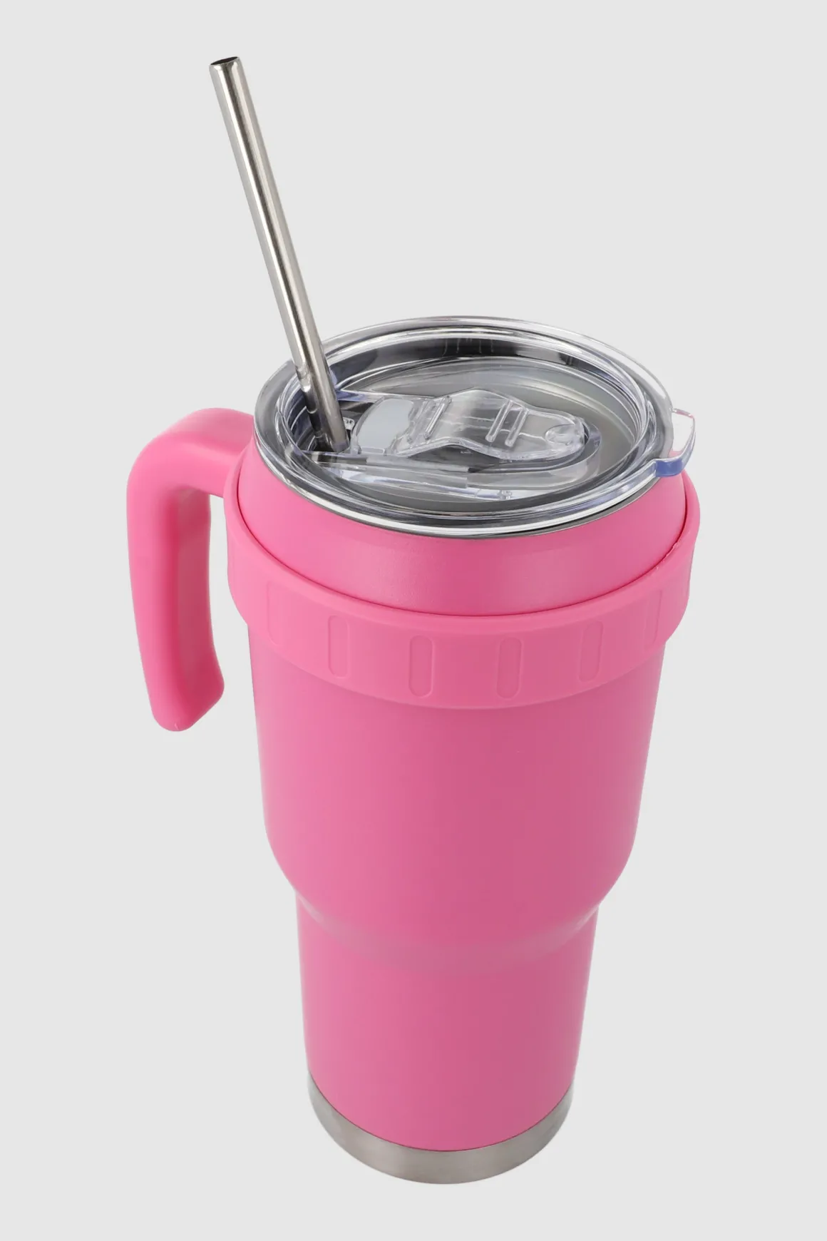 El vaso de acero con manija y popote es ideal para quienes buscan practicidad y estilo en su día a día.