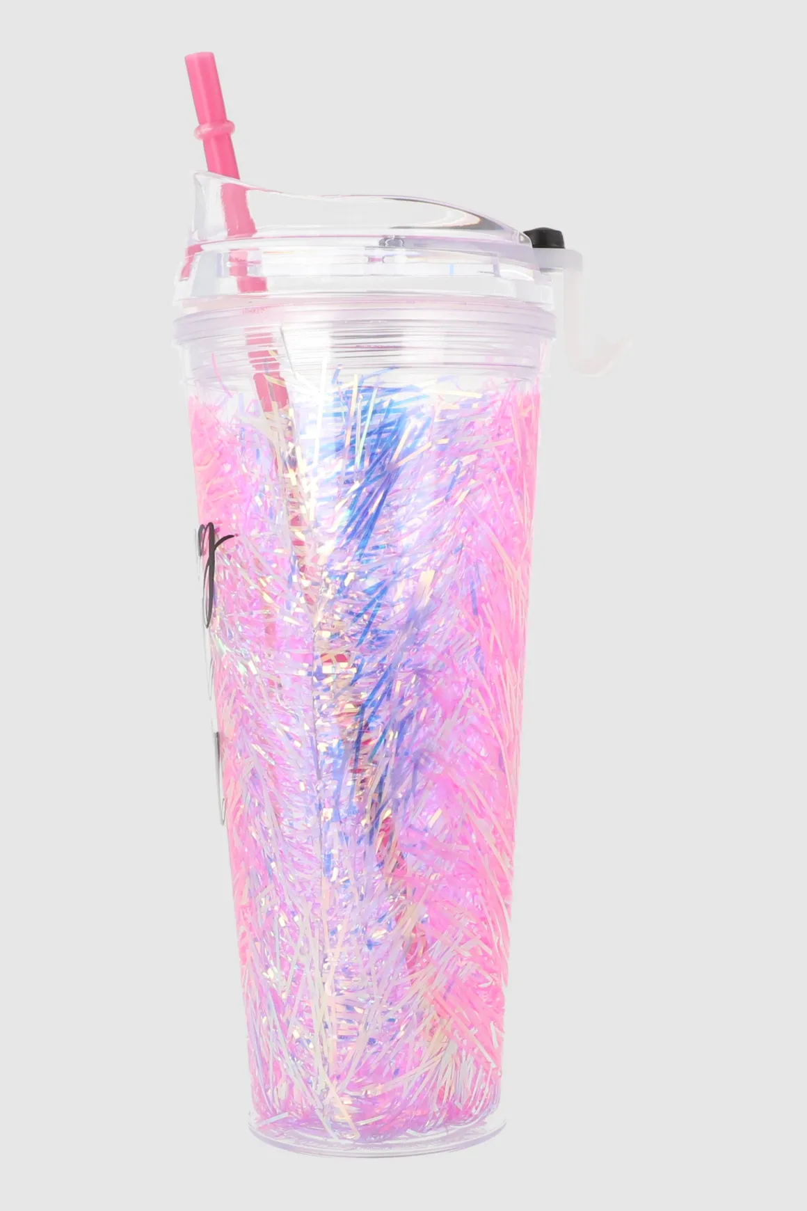 Vaso de doble pared en plástico. Con un diseño llamativo que incluye un estampado de frase y confeti holograma. Tapa enroscable que asegura un cierre hermético para evitar derrames. Incluye un popote para mayor comodidad al beber.