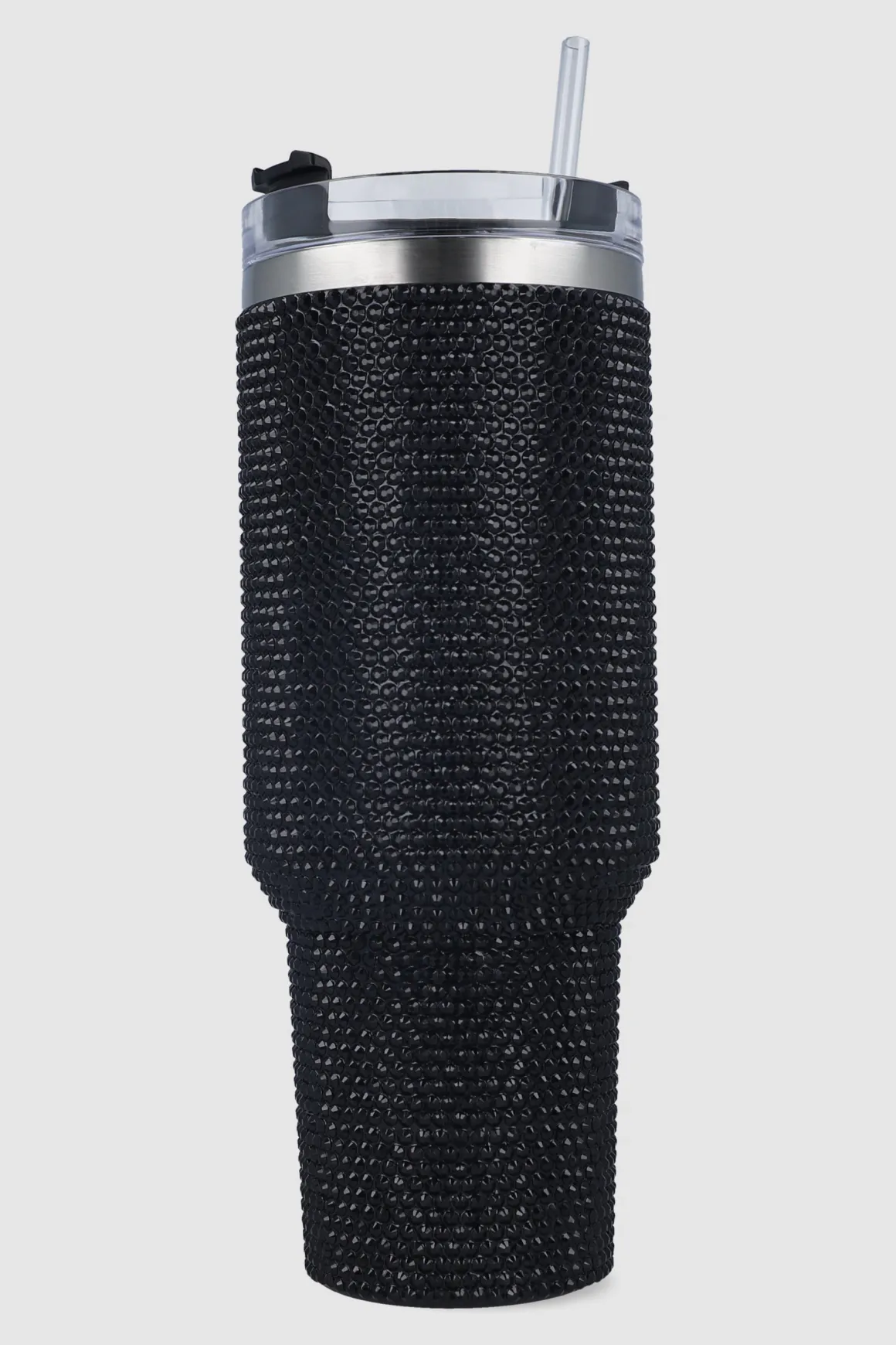 Vaso termo de acero con asa y aplicación total de brillos. Cierre mediante tapa con anillo de silicona y orificio para popote. Capacidad de 900 ml. BPA FREE..
