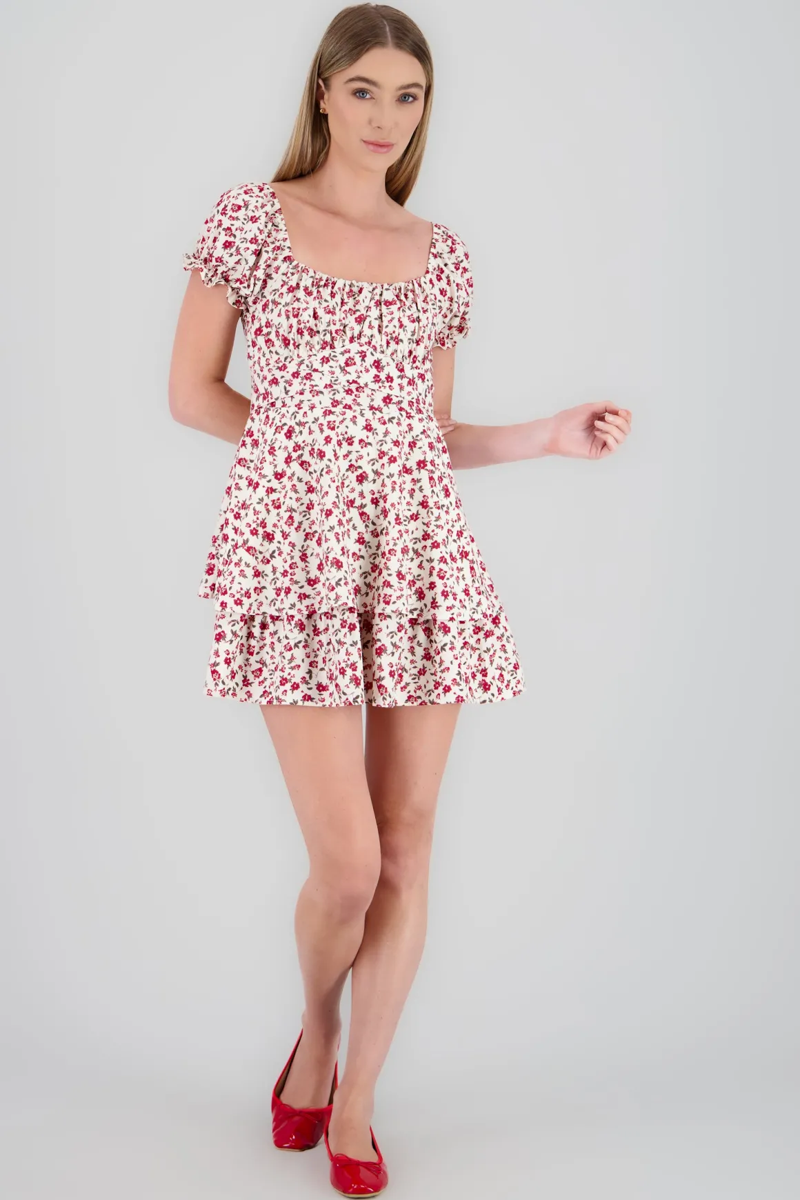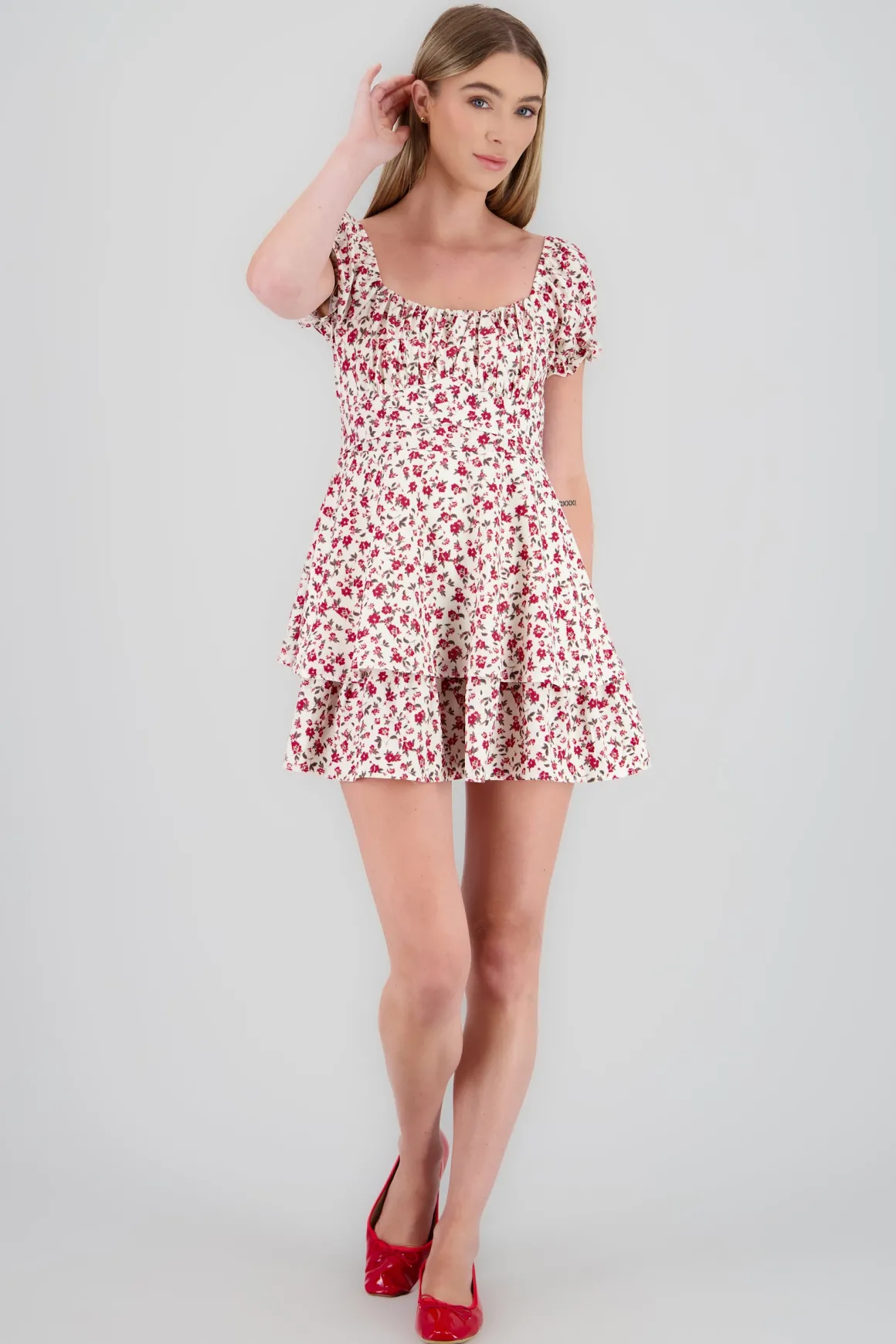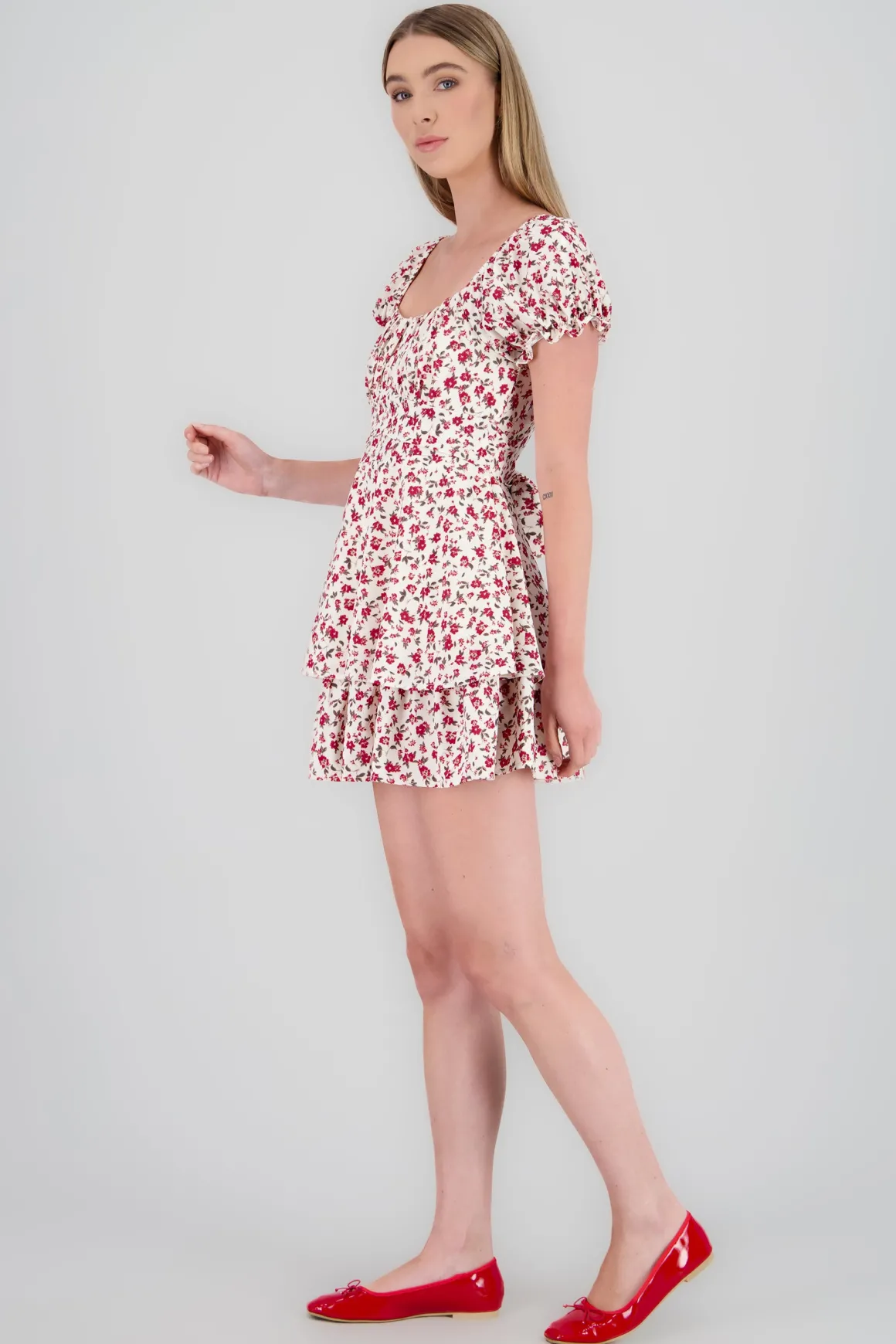 Este vestido presenta un hermoso estampado de flores, junto con un escote cuadrado tanto en la parte frontal como en la espalda. Las mangas cortas abullonadas añaden un toque de feminidad, mientras que la cinta ancha alrededor de la cintura, con un delicado moño en la espalda, realza la silueta de forma única. Este vestido es perfecto para lucir un look fresco y primaveral en cualquier ocasión.
