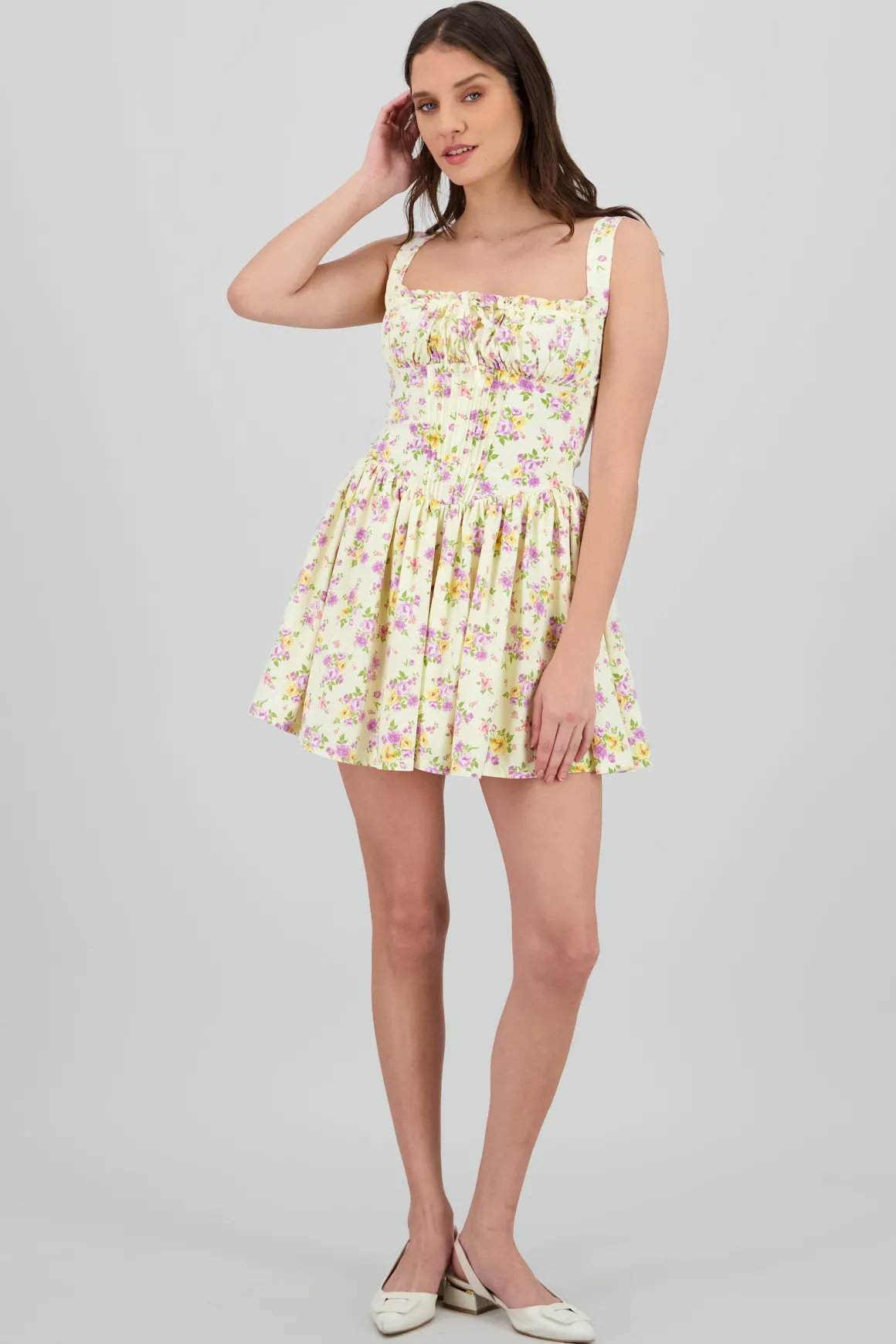 Vestido mini escote plisado flores