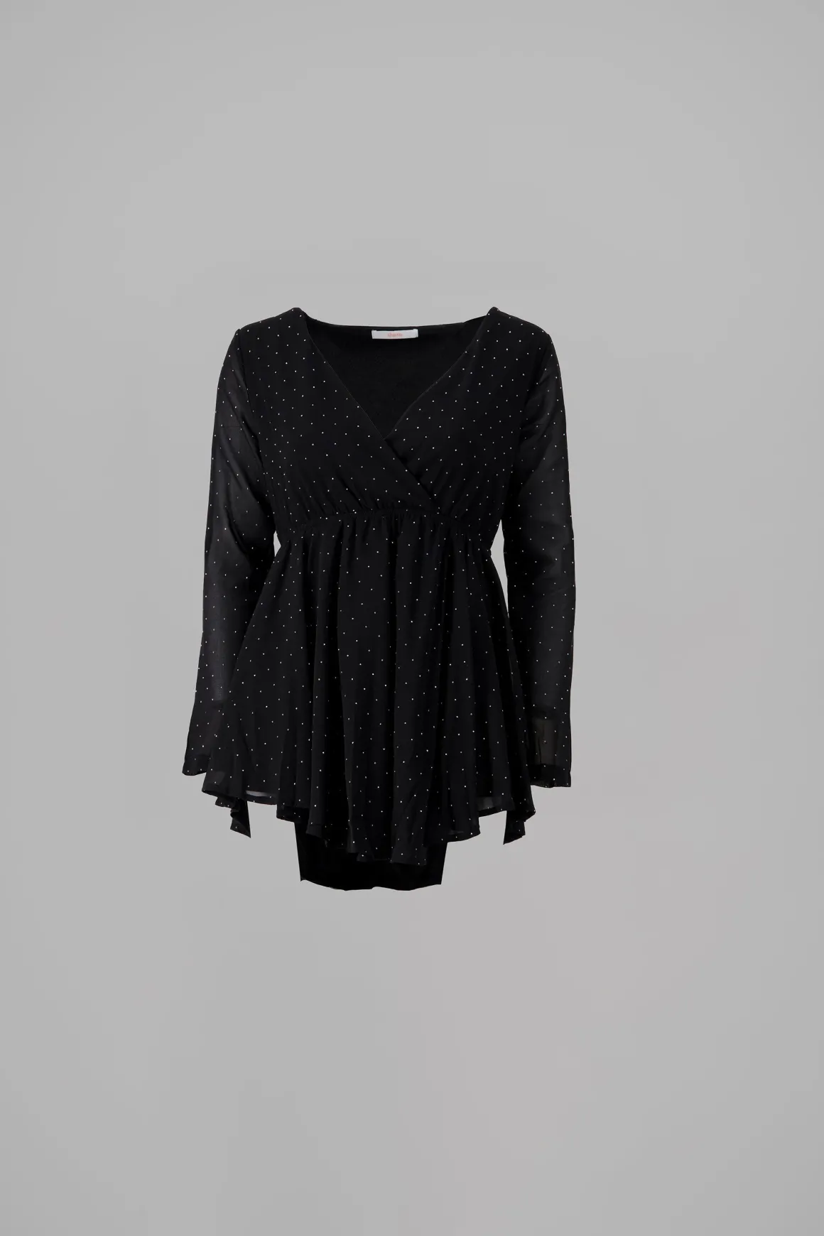 Este vestido es la elección perfecta para aquellas mujeres que desean lucir formales y a la moda. Con su diseño semitransparente y aplicación de brillos, es ideal para eventos especiales o salidas nocturnas. La manga larga y el escote v cruzado le dan un toque cómodo, mientras que la parte baja fluida con diseño plisado garantiza comodidad y movimiento. ¡Destaca entre la multitud con este hermoso vestido!