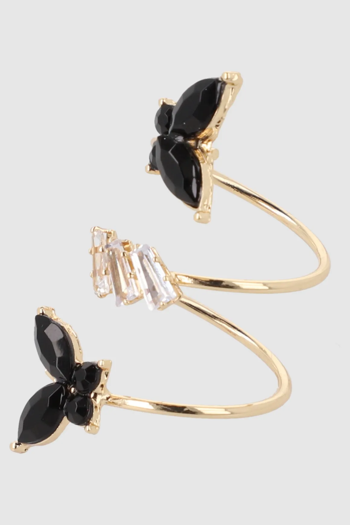 Anillo circundante liso con acrílicos transparentes al centro. En las terminaciones del anillo acrílico oscuro con brillos en forma de mariposa.