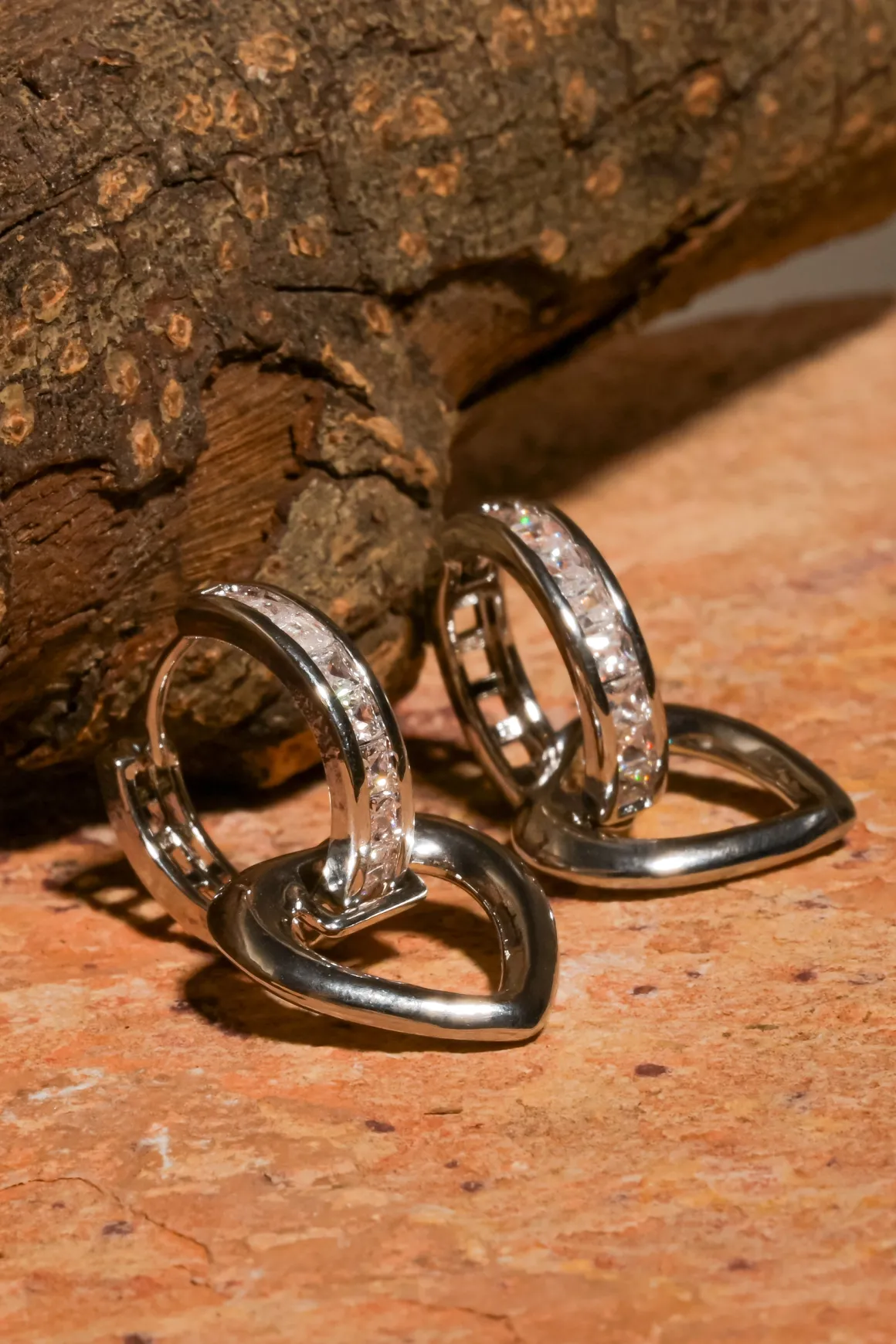 - Corazones colgantes adornados con zirconias y una hilera de cristales deslumbrantes.