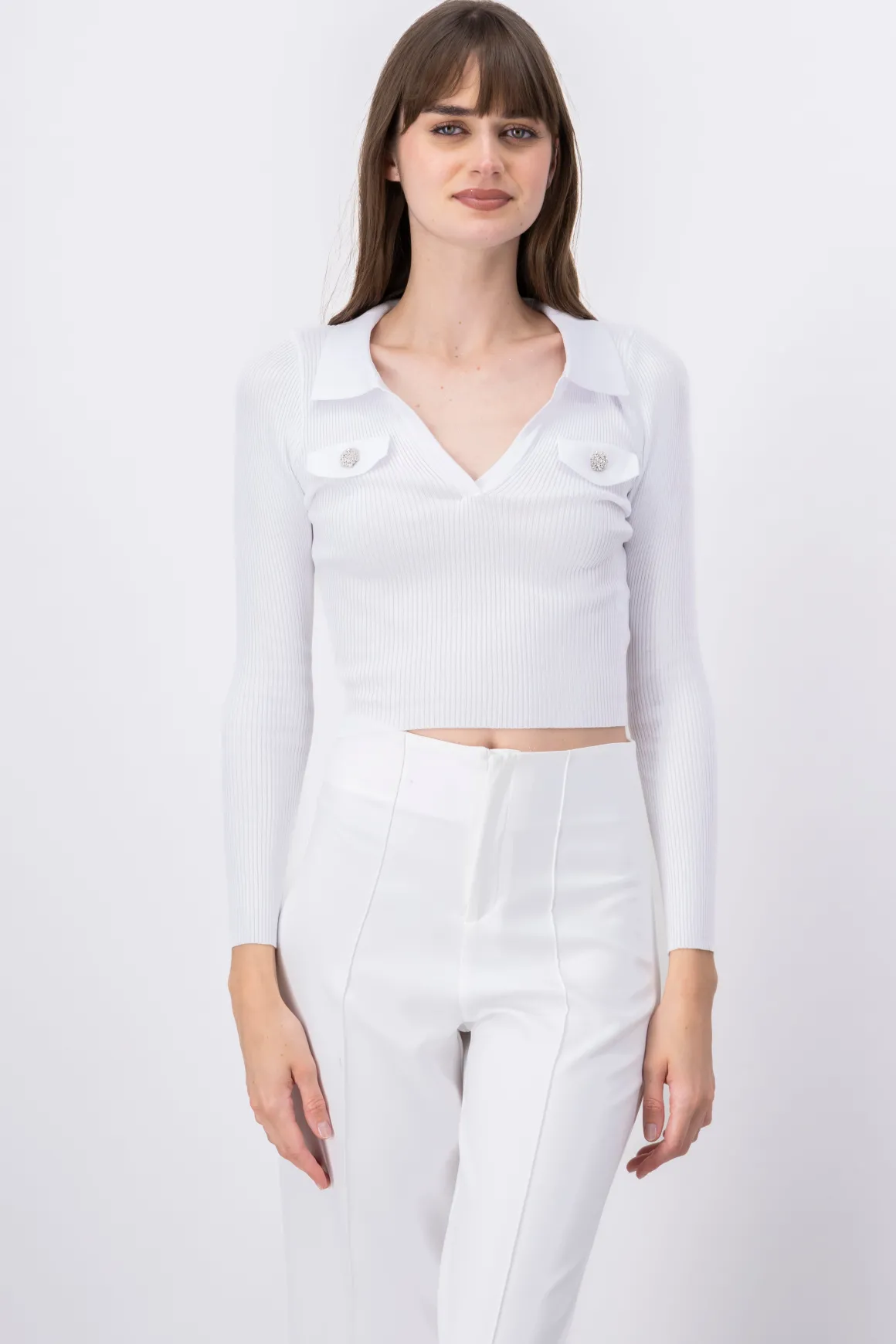 Blusa acanalada de manga larga y cuello polo con escote v. Brillos frontales.