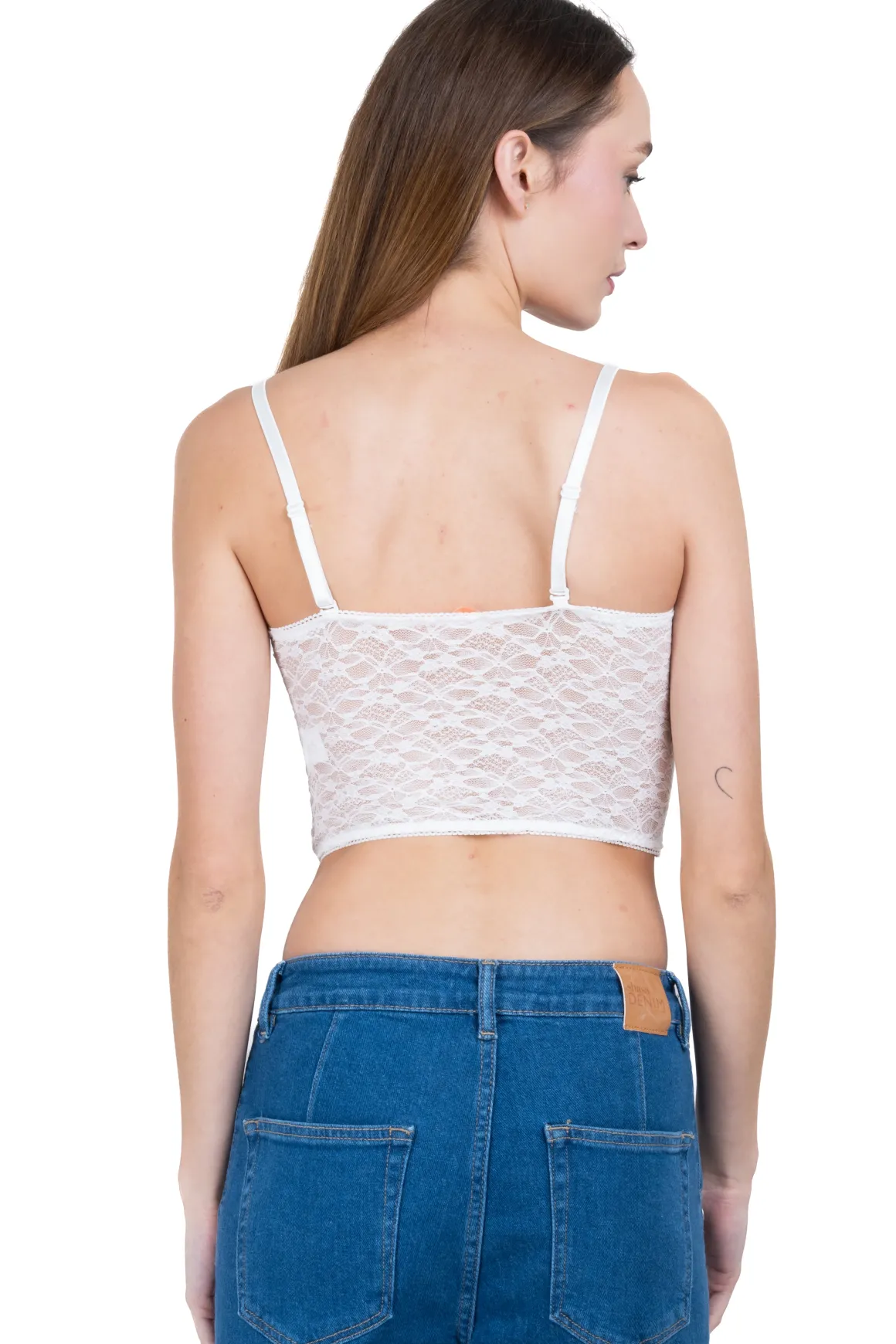 Blusa corset monocolor de encaje con tirantes delgados y cierre mediante broches delanteros.