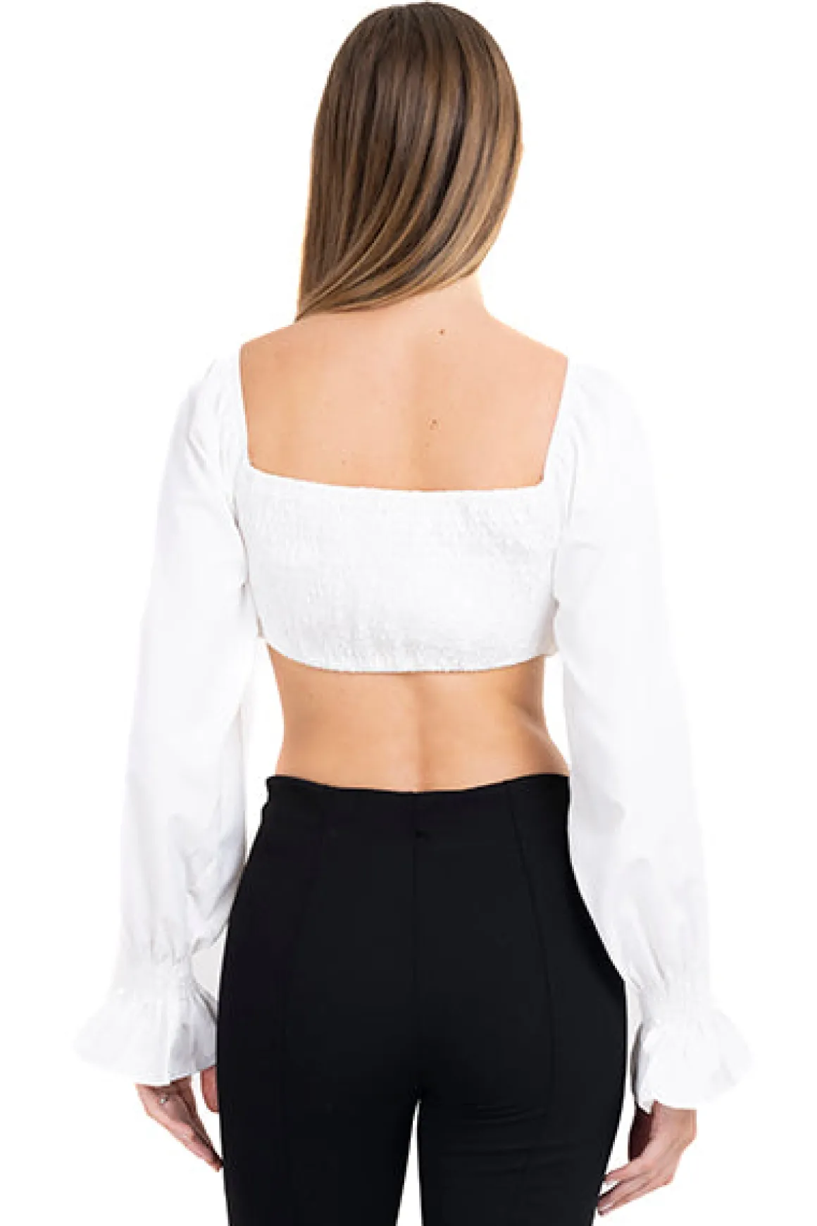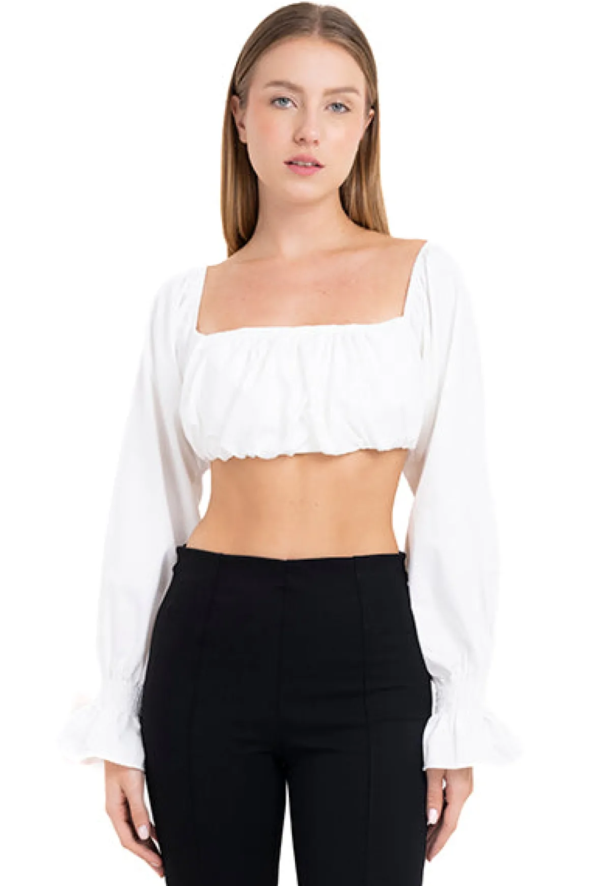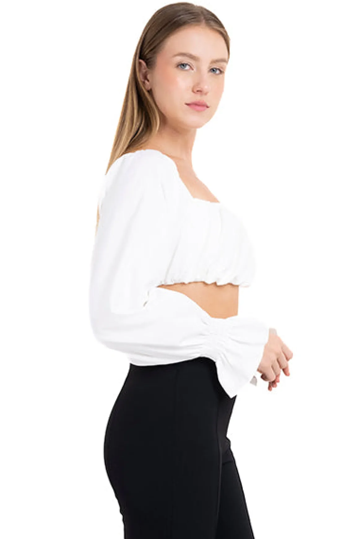 Blusa crop lisa de manga larga abullonada, escote recto con fruncido en pecho y elástico en espalda.