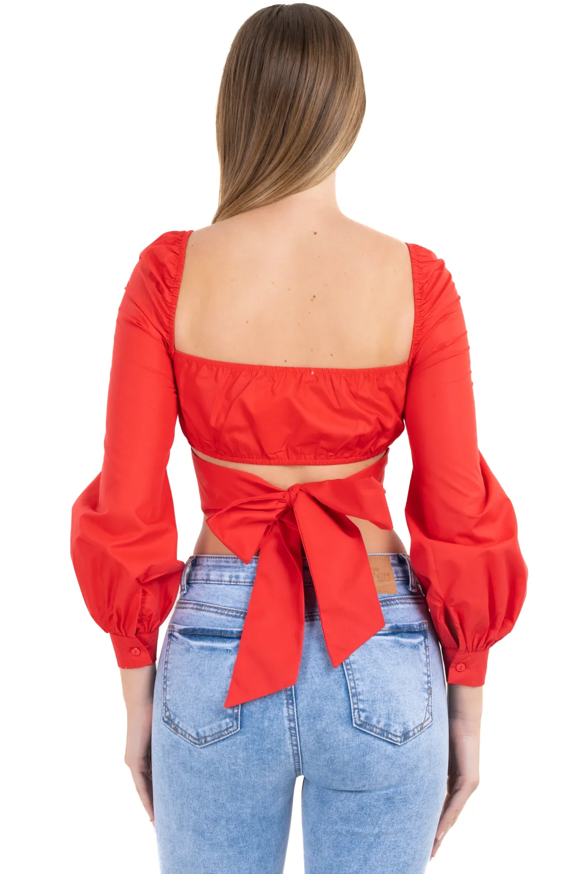 Blusa crop de escote recto con detalle plisado en busto. Manga larga abullonada con botón en puño. Espalda descubierta con cinta ancha en mismo tono.