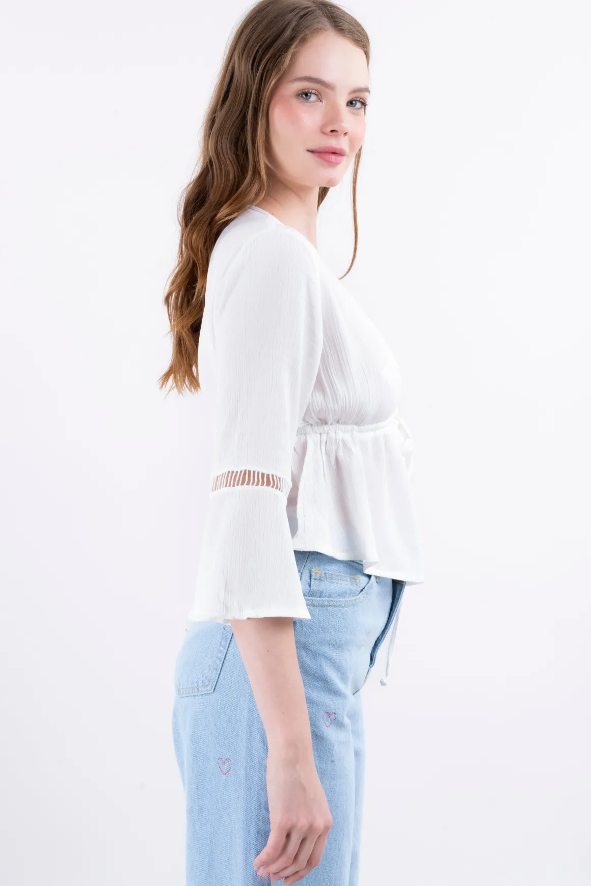 Blusa lisa de escote v profundo con cintas para moño, mangas 3/4 con corte y unión decorado.
