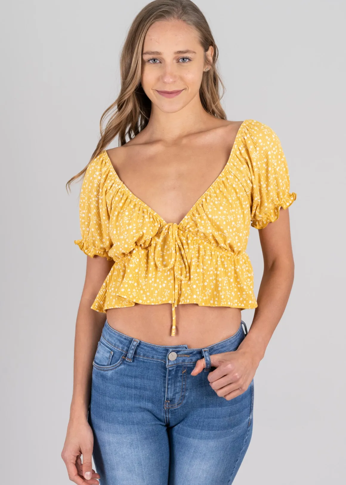 Blusa estampada de flores con manga corta abullonada, cintas delanteras.