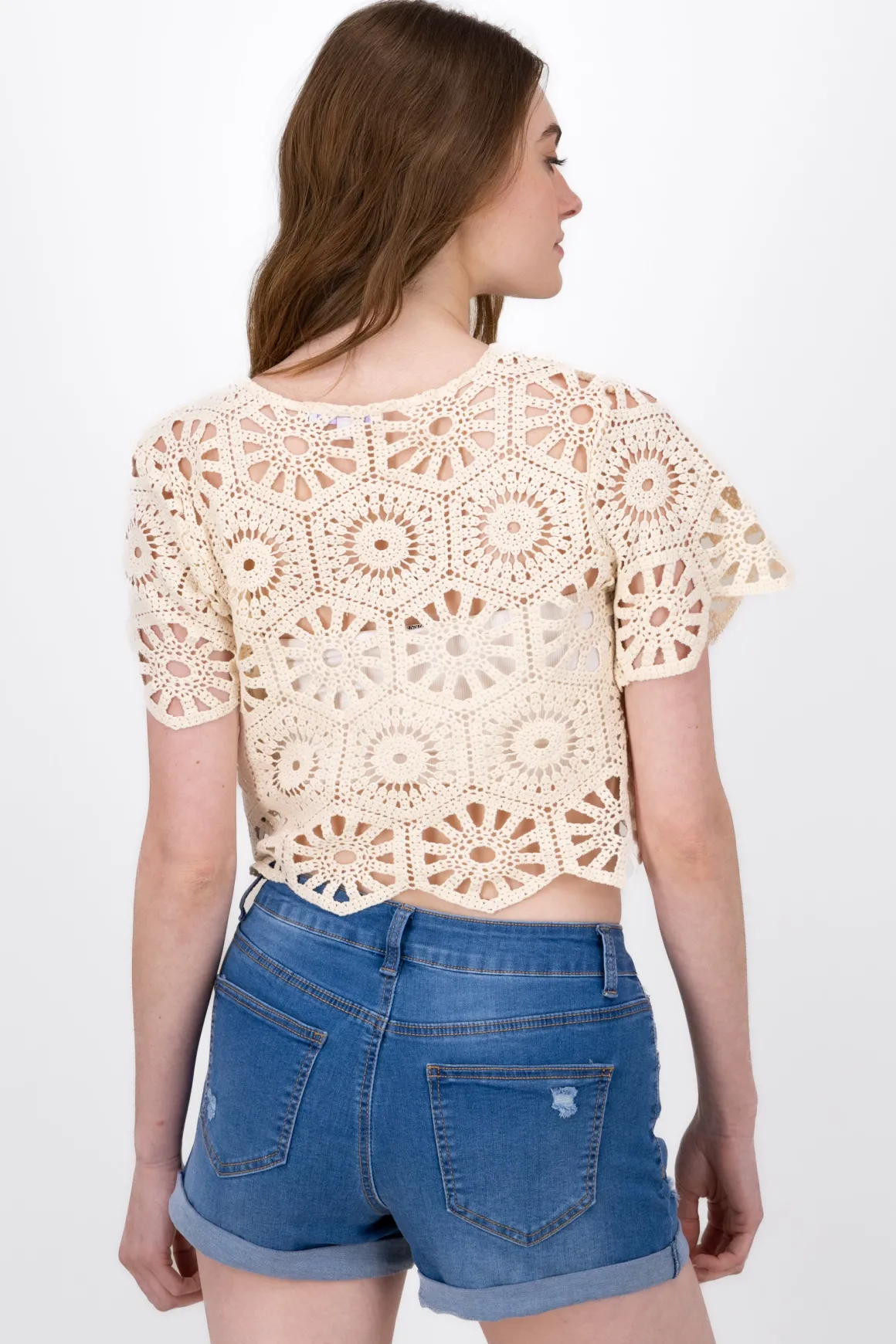 Dale un toque boho a tu armario con esta blusa de diseño crochet. Con sus mangas cortas y cuello redondo, es perfecta para cualquier ocasión casual. Su estilo versátil te permite combinarla con jeans, faldas o shorts para un look fresco y juvenil. Ideal para los días de verano o para agregar una capa texturizada a tu outfit. Añade esta pieza imprescindible a tu colección y luce fabulosa sin esfuerzo.