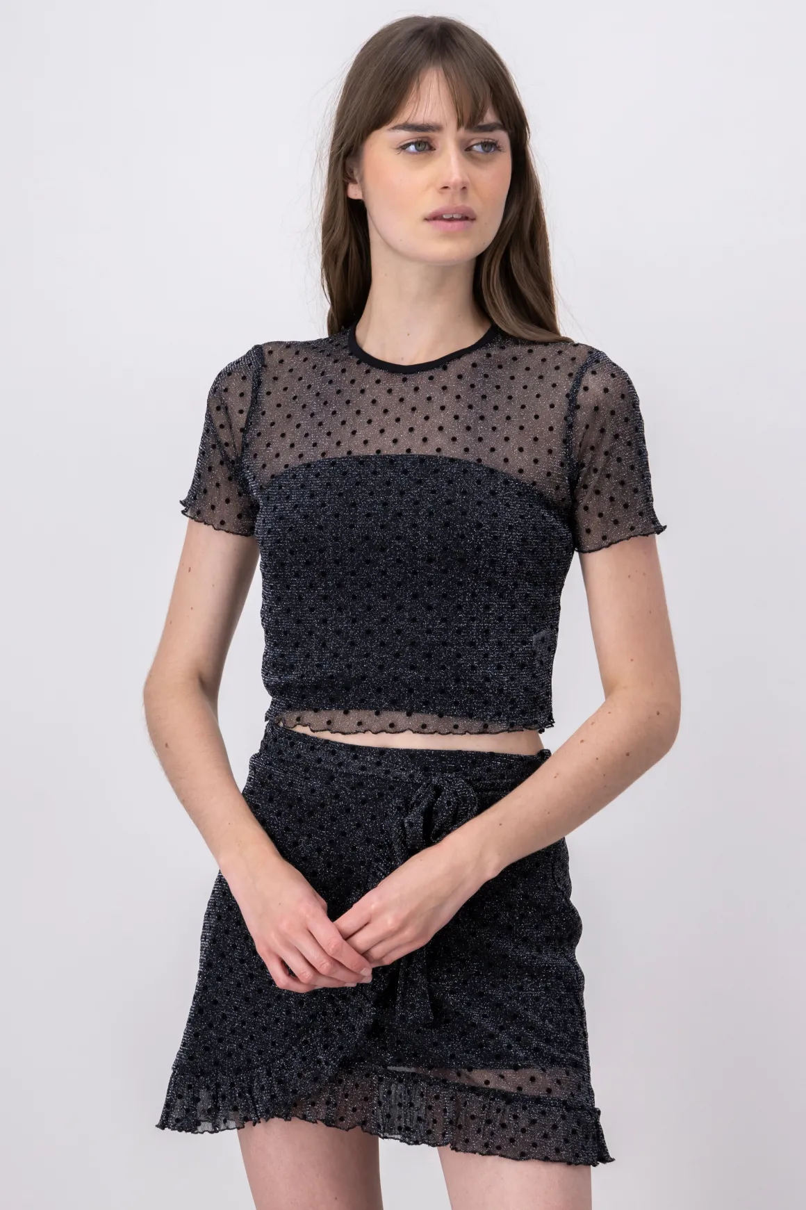 Blusa de mesh de manga corta con cuello redondo perfecta para destacar tu estilo. El estampado de lunares le da un toque divertido y moderno, mientras que el efecto glitter añade un brillo sutil pero elegante a tu outfit.