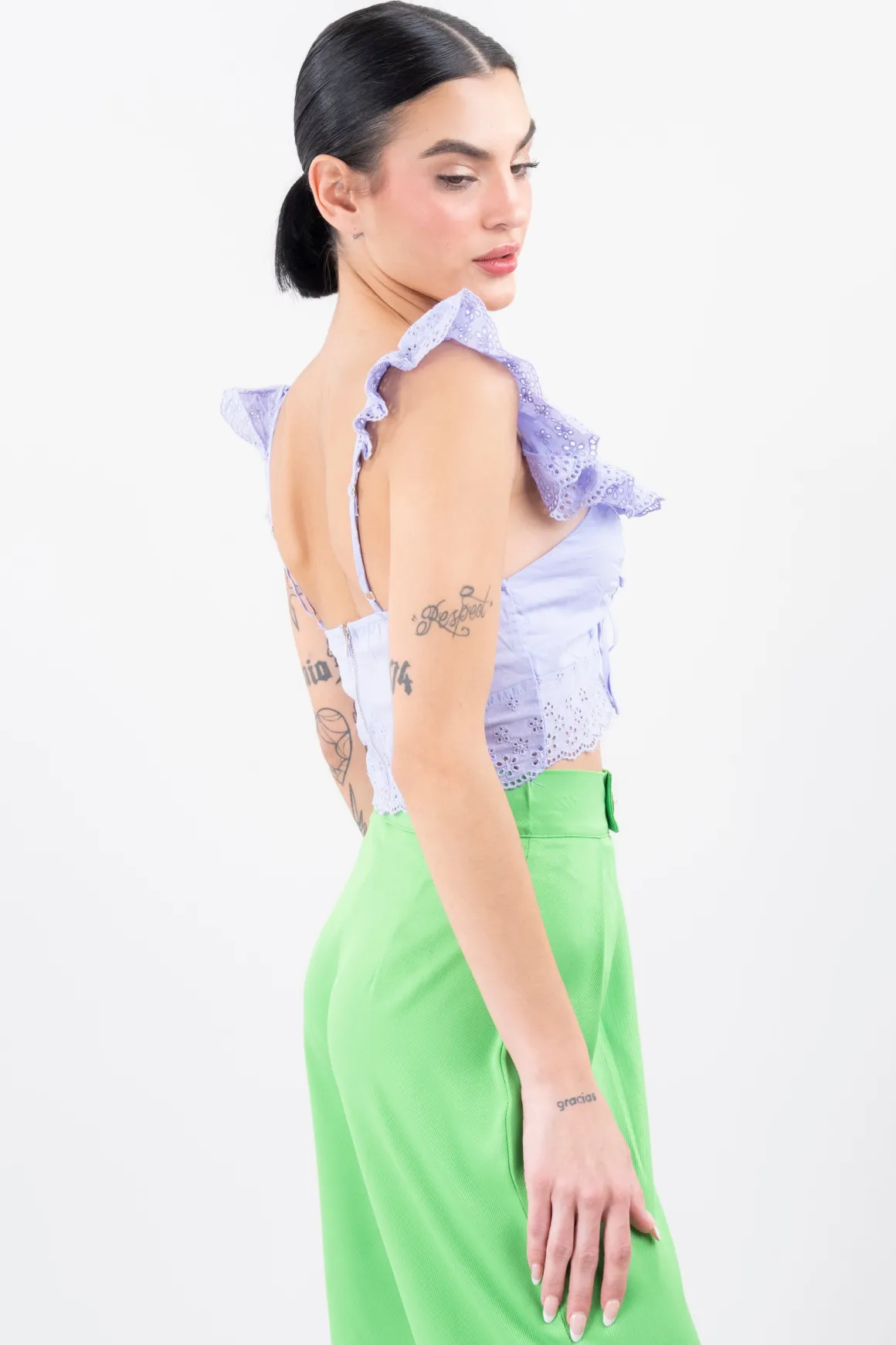 Blusa de tirantes delgados con olán. Escote con abertura v y cintas. Diseño eyelet de flores. Cierre metálico trasero.