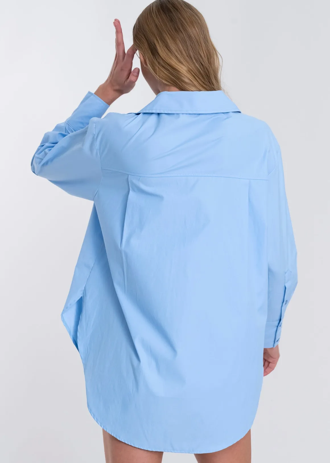 Blusa de cuello solapa. Manga larga con elevadores acabada en puño. Bolsillo frontal. Bajo asimétrico con aberturas laterales