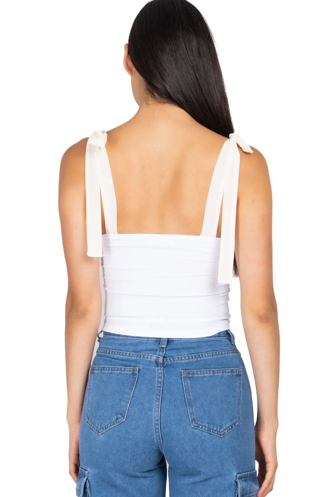 Blusa monocolor de escote corazón con busto fruncido y cintas anchas de tirantes para amarre.