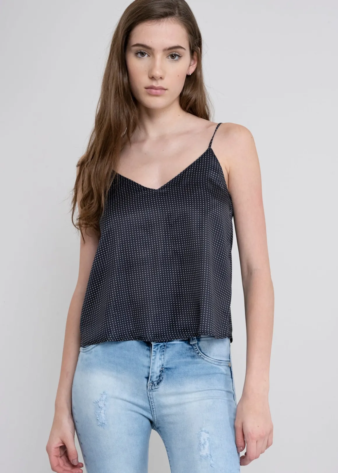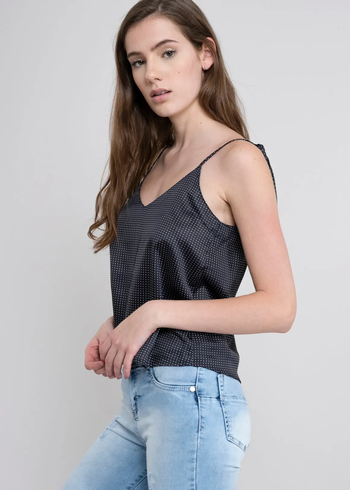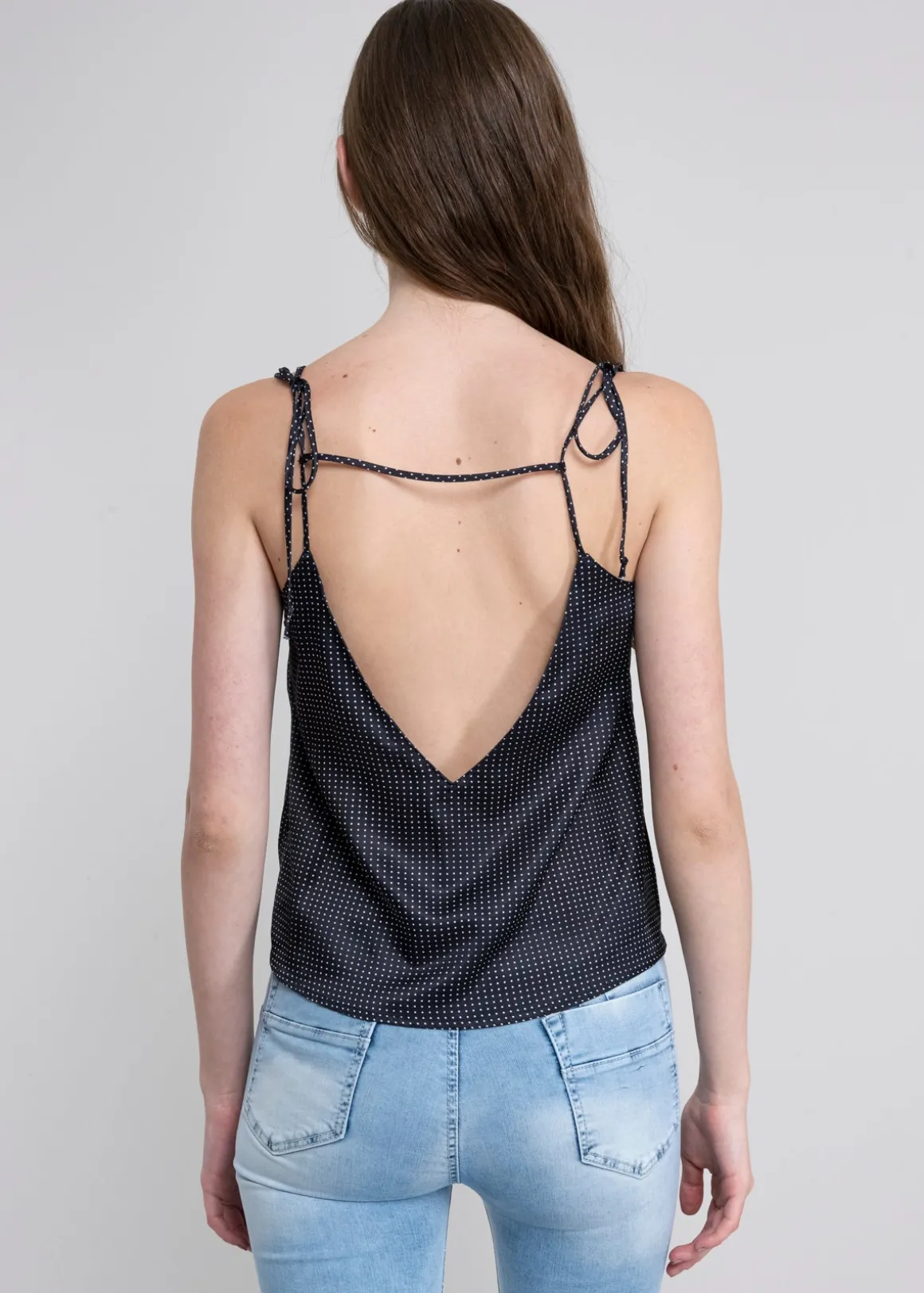 Blusa estampado polka dot. Escote v delantero y en la espalda con tirantes.