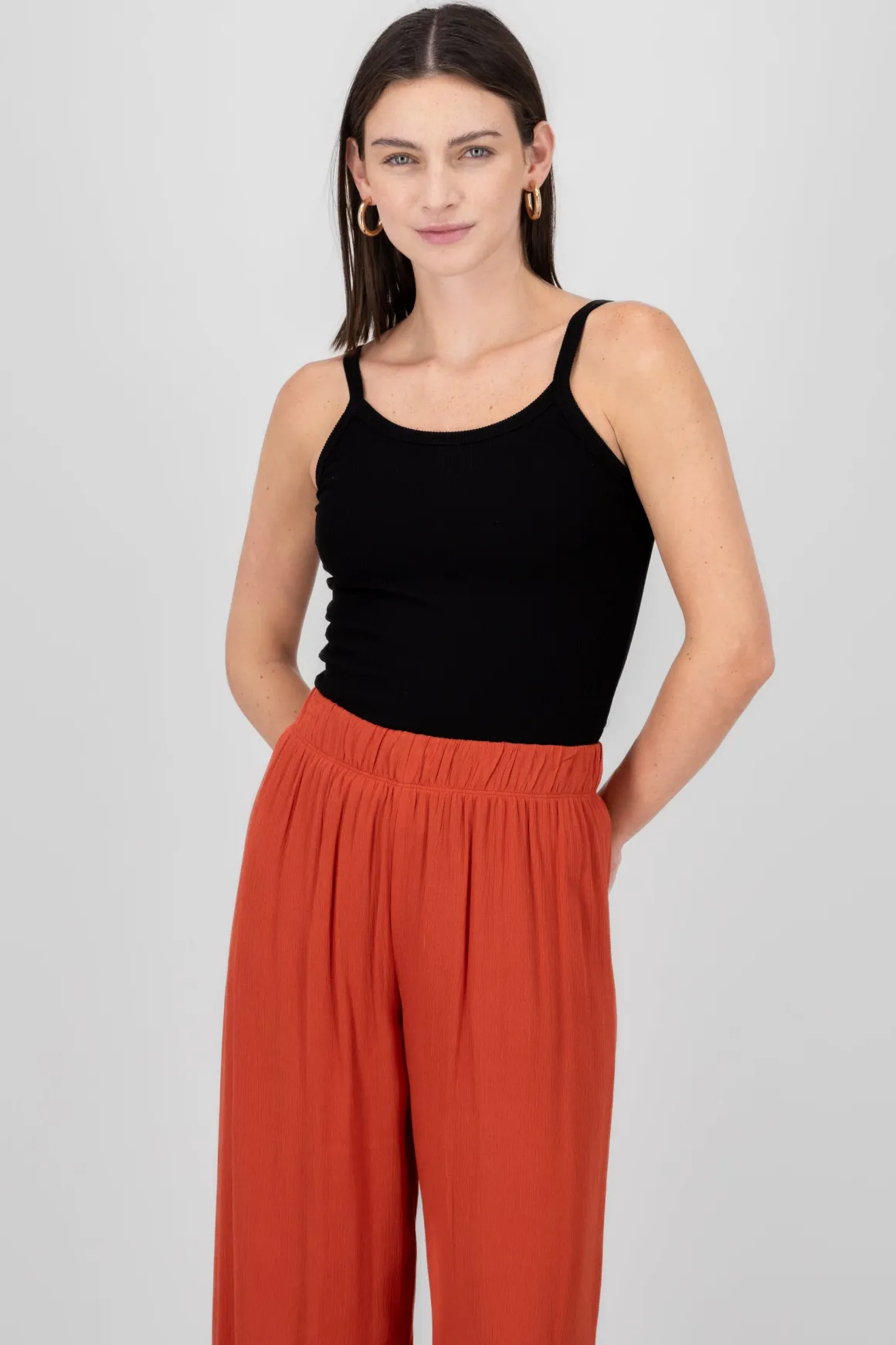 Nuestra blusa acanalada lisa con tirantes y escote redondo es un básico versátil para cualquier armario.