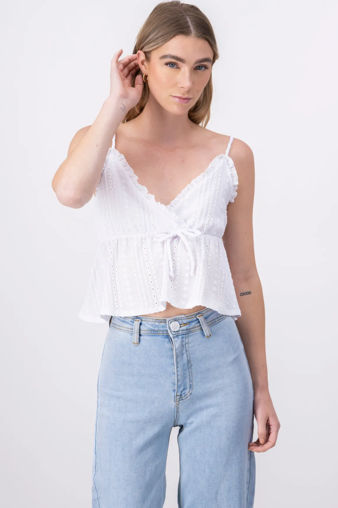 Impresiona con estilo y elegancia con nuestra blusa tirantes textura cinta. Esta blusa única presenta un diseño moderno con tirantes delgados y un escote en V cruzado que realza tu figura de manera elegante. Además, cuenta con una cinta para moño en la parte delantera que agrega un toque de sofisticación a tu atuendo.