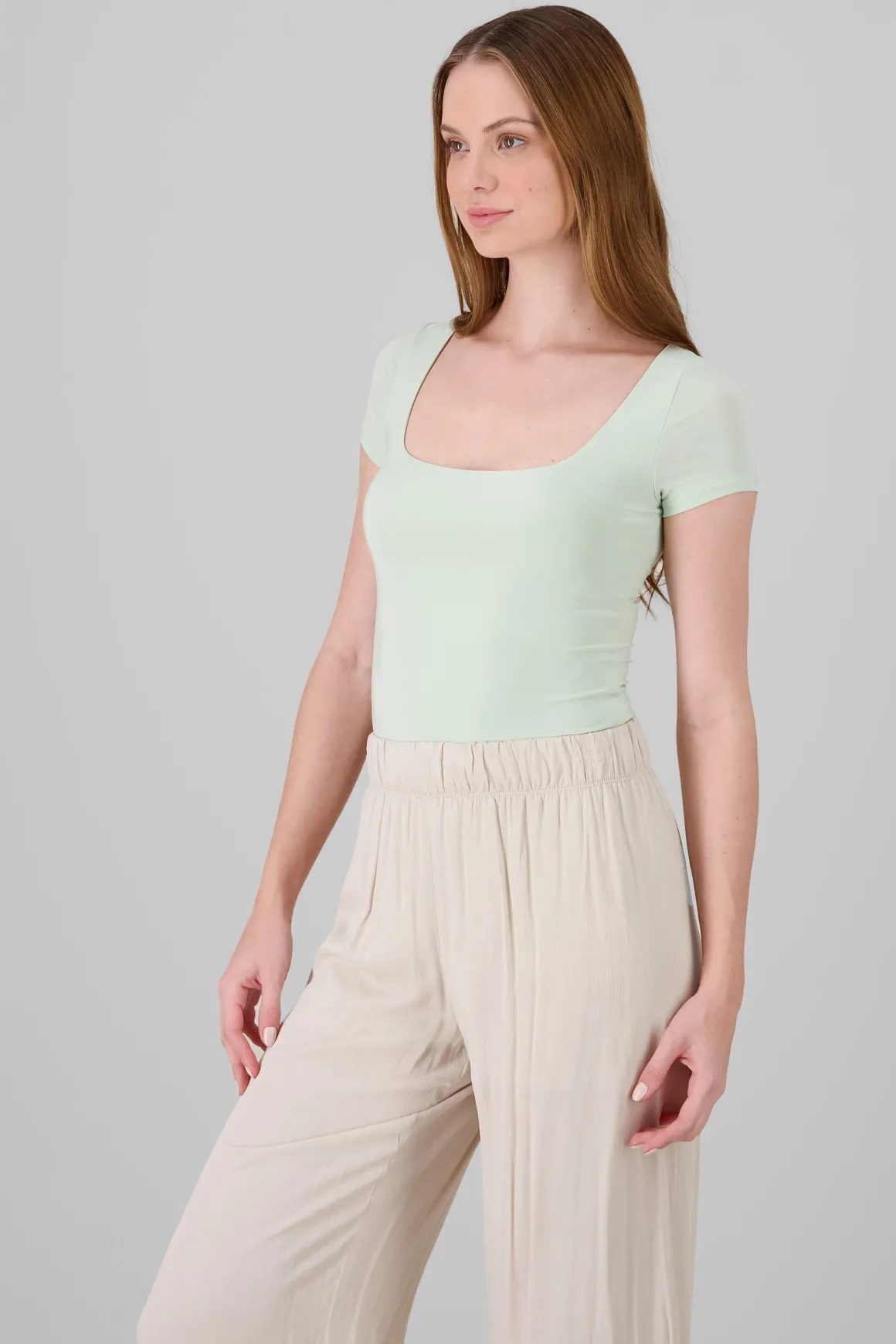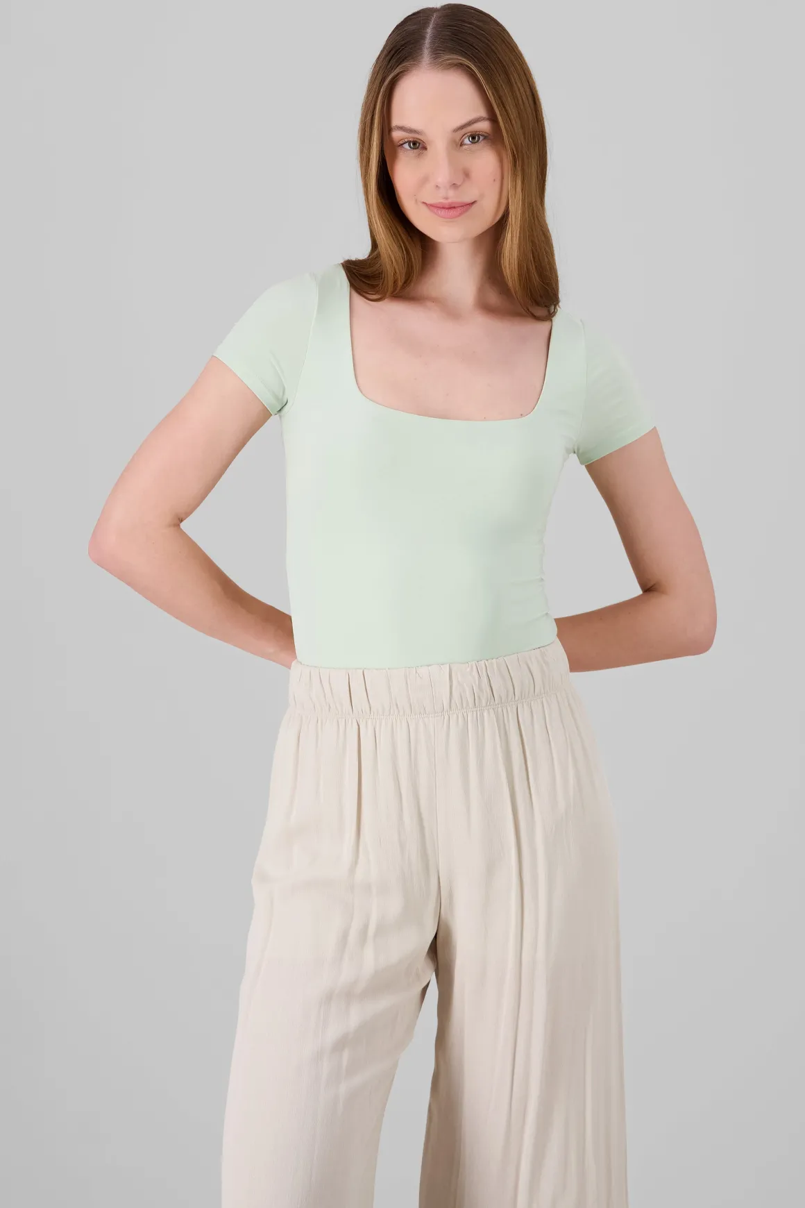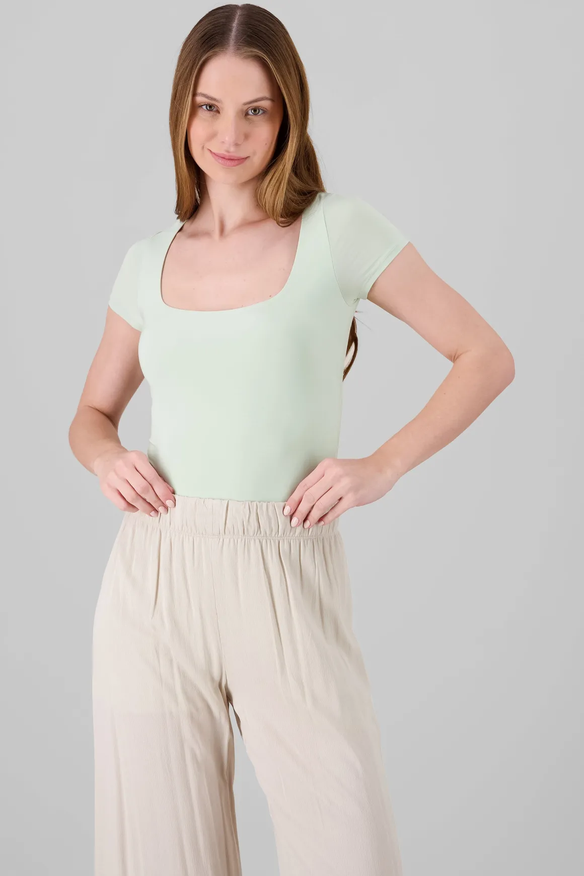 Luce fresca y a la moda con este bodysuit de manga corta y escote cuadrado. Su diseño sencillo lo hace ideal para combinar con todo tipo de prendas y estilos. Perfecto para un look casual o más formal.