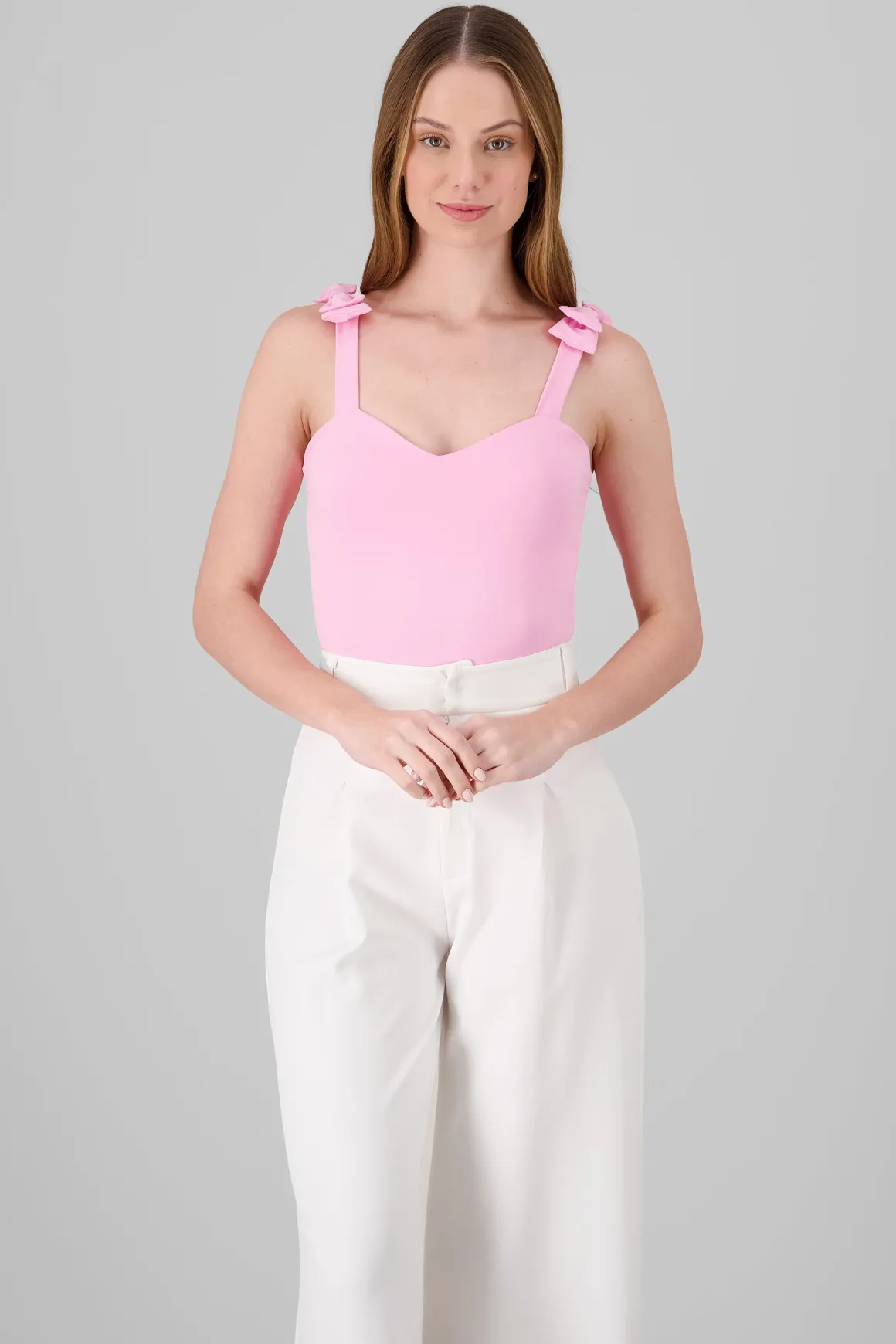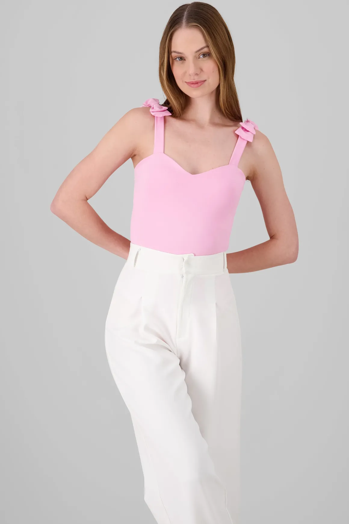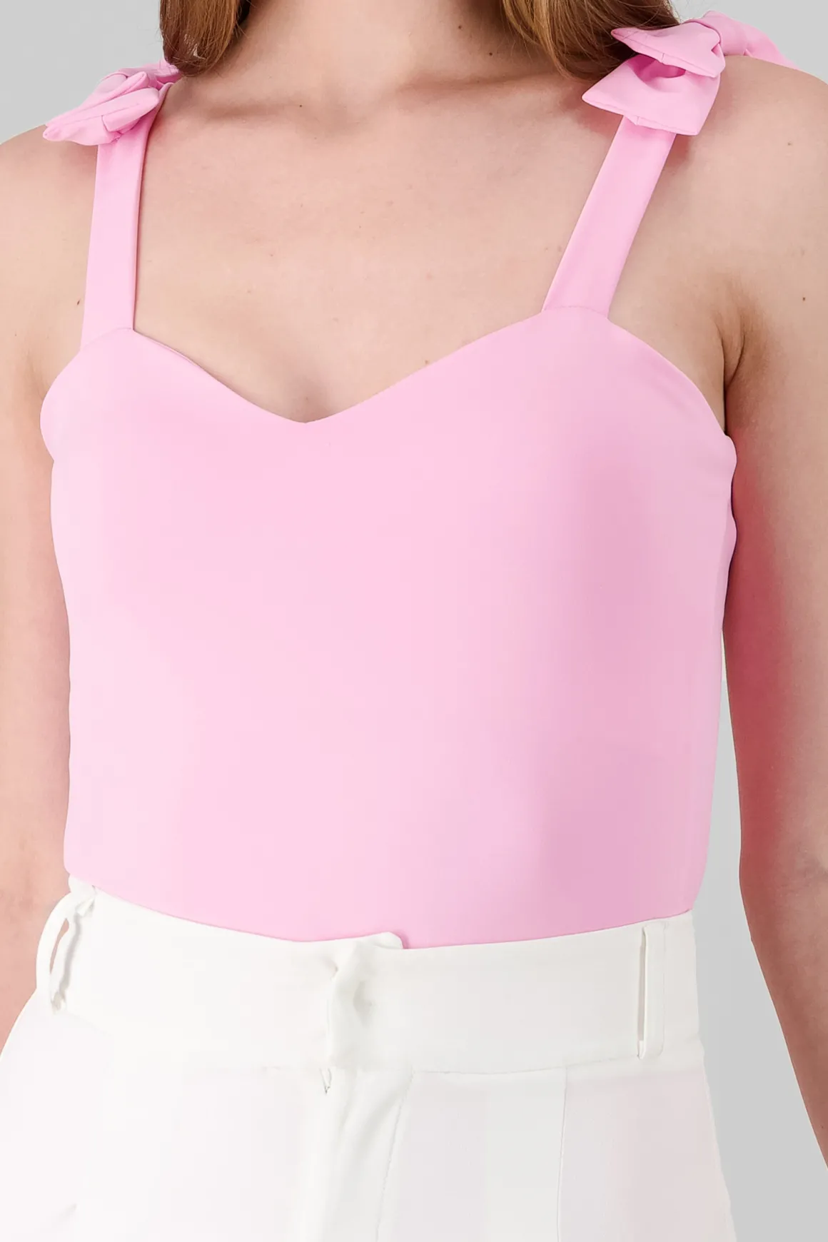 Destaca con nuestro bodysuit liso de tirantes, con un encantador detalle de moño en la parte superior y un favorecedor escote corazón. Ideal para crear looks versátiles y modernos, este bodysuit es imprescindible para tu colección de ropa casual.