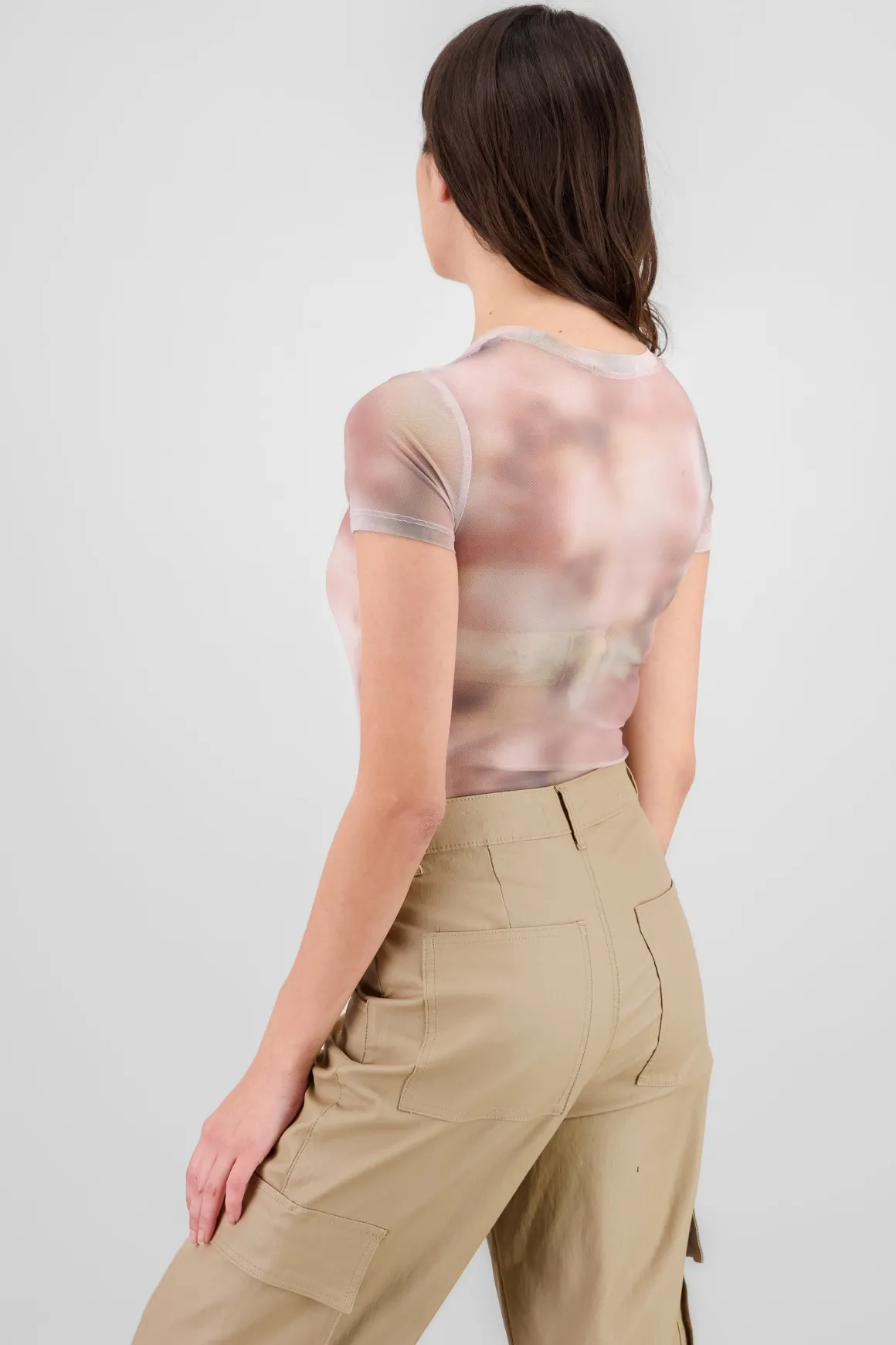 Este bodysuit mesh de manga corta es la prenda que necesitas para destacar. Con su diseño de estampado degradado y cuello redondo, es perfecto para crear un look audaz y moderno. Ideal para combinar con jeans de cintura alta o faldas ajustadas, dando ese toque edgy que buscas.