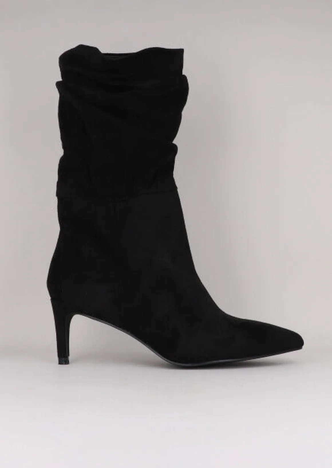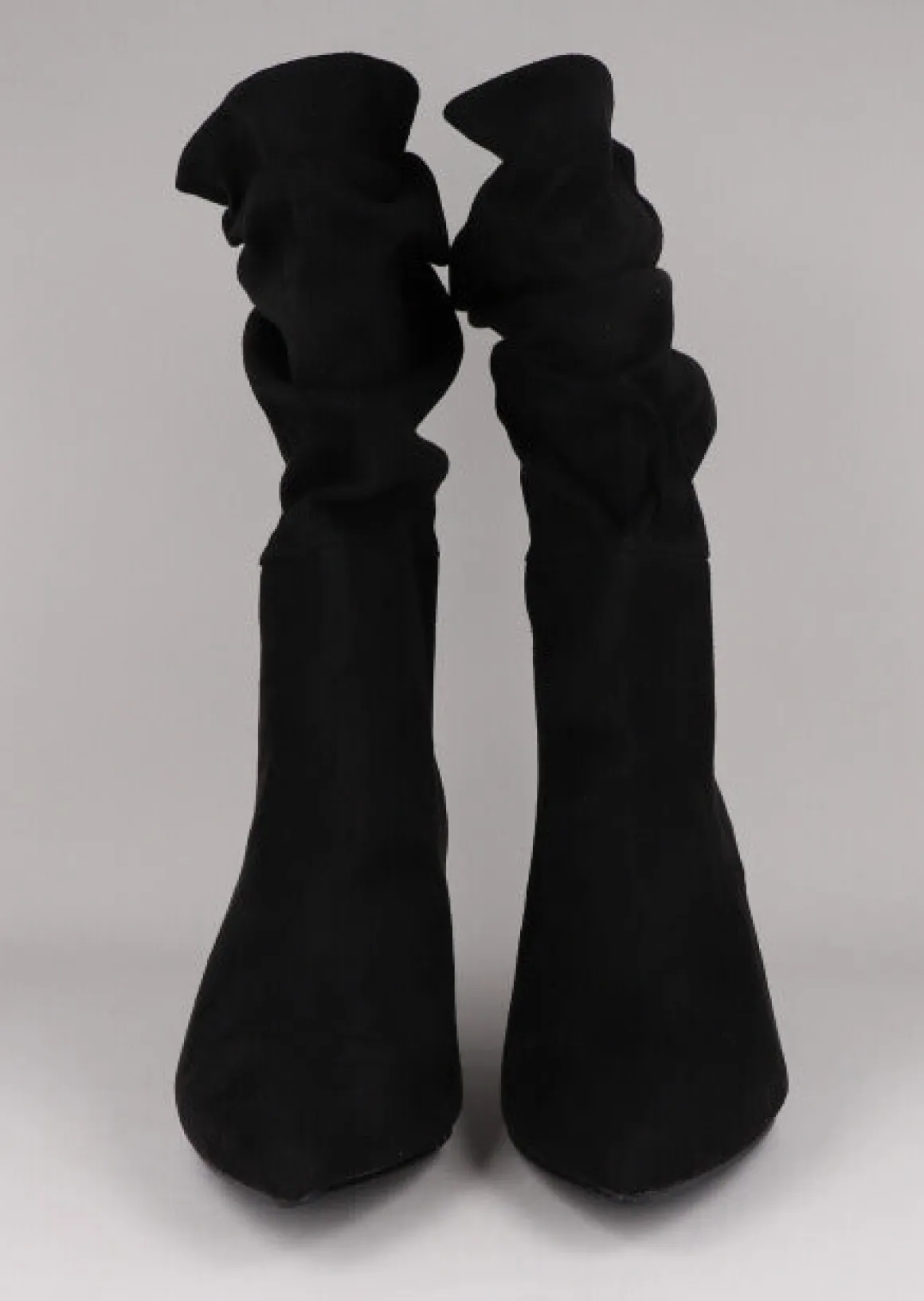 Botas puntales con tubo fruncido y tacón delgado corto.