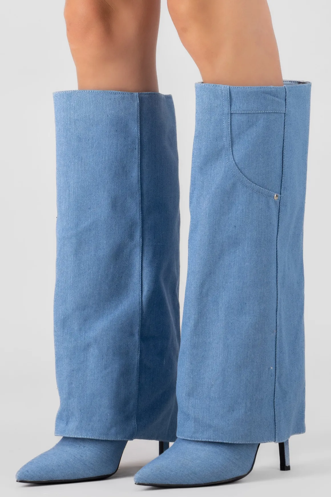 Estas botas en denim son todo lo que necesitas para destacar. Su diseño puntal y tacón delgado te darán altura y estilo en cualquier ocasión. La funda superior recta les da un toque moderno y cool, ideal para combinar con vestidos o jeans. ¡Serás el centro de atención con estas botas!