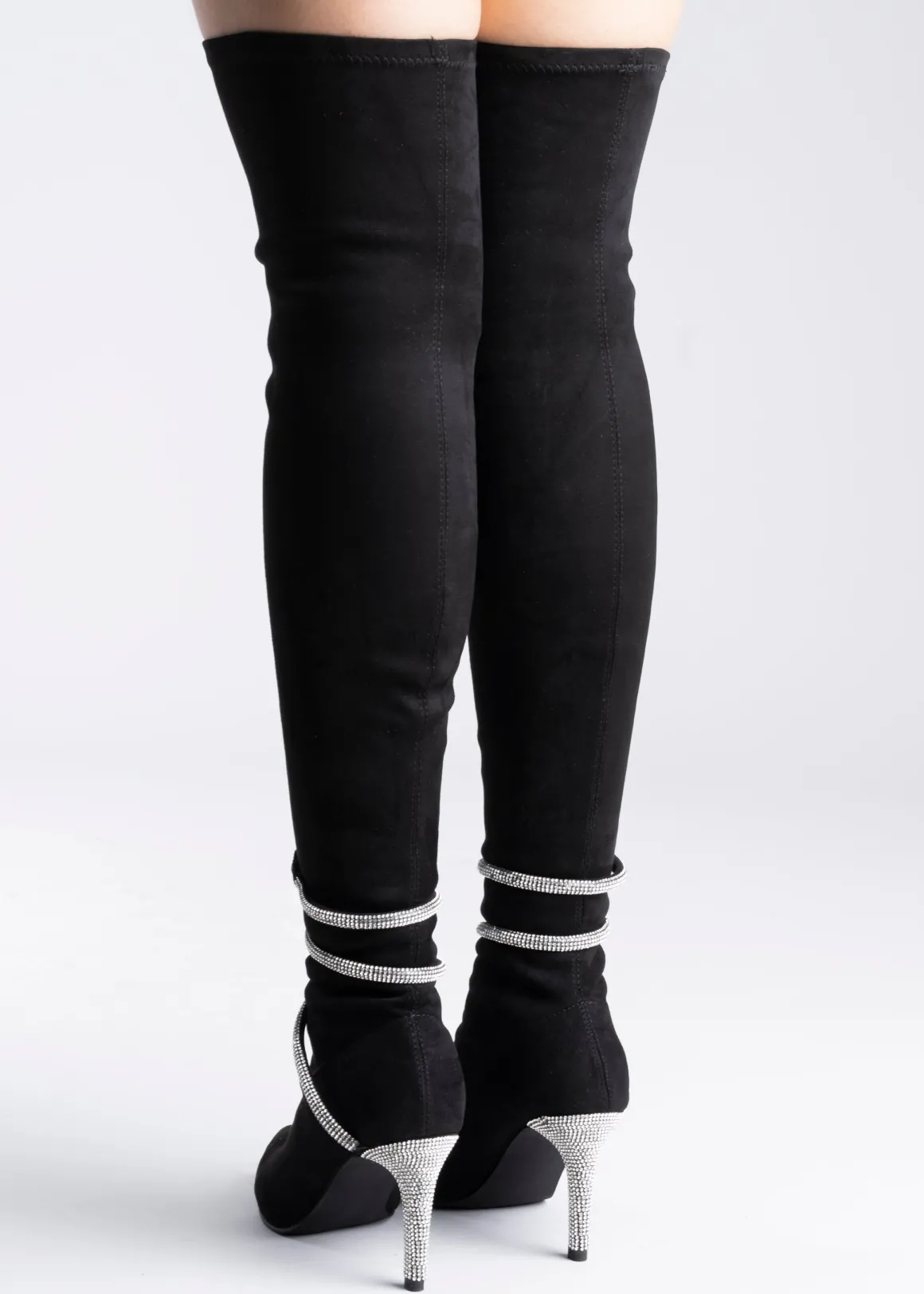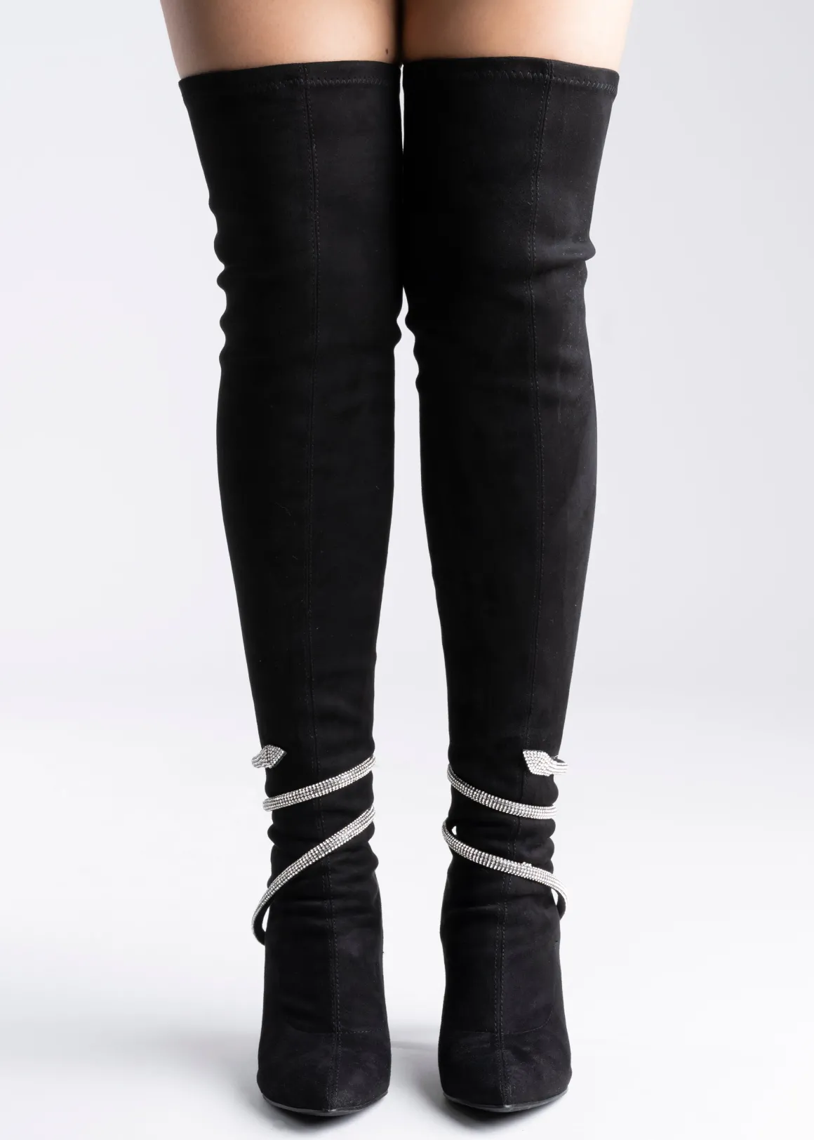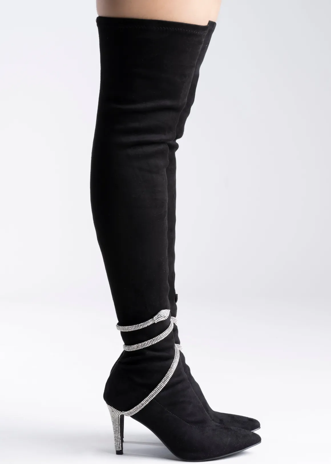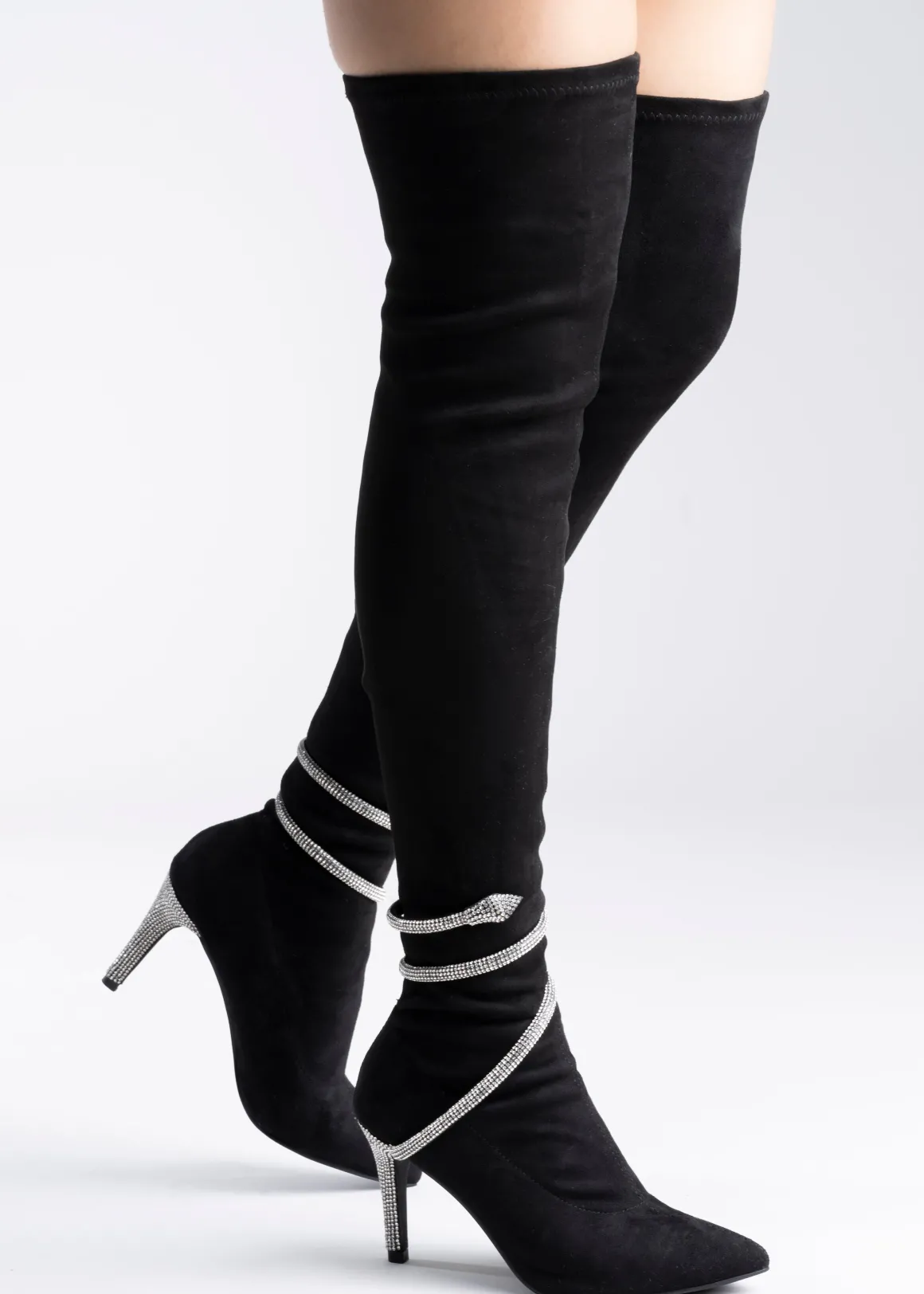 Botas puntales largas. Tacón delgado y pulsera de serpierte con aplicación de brillos.