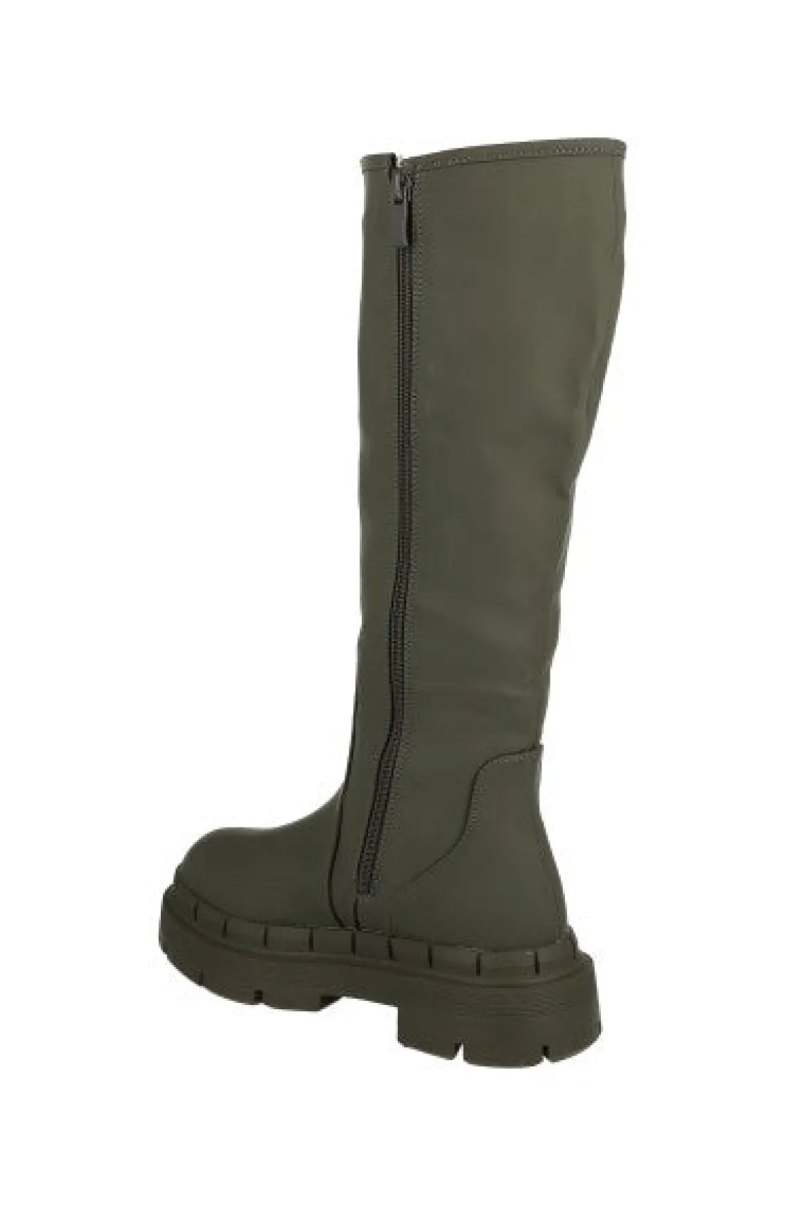 Bota maxi efecto piel. Suela trucker con volumen y diseño. Cierre con zipper a los costados.