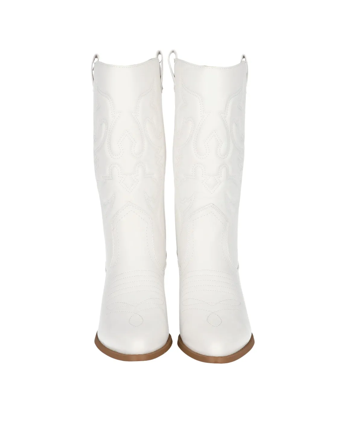 Bota vaquera de efecto piel con tacón bloque bajo. Con bordados y tiradores laterales.