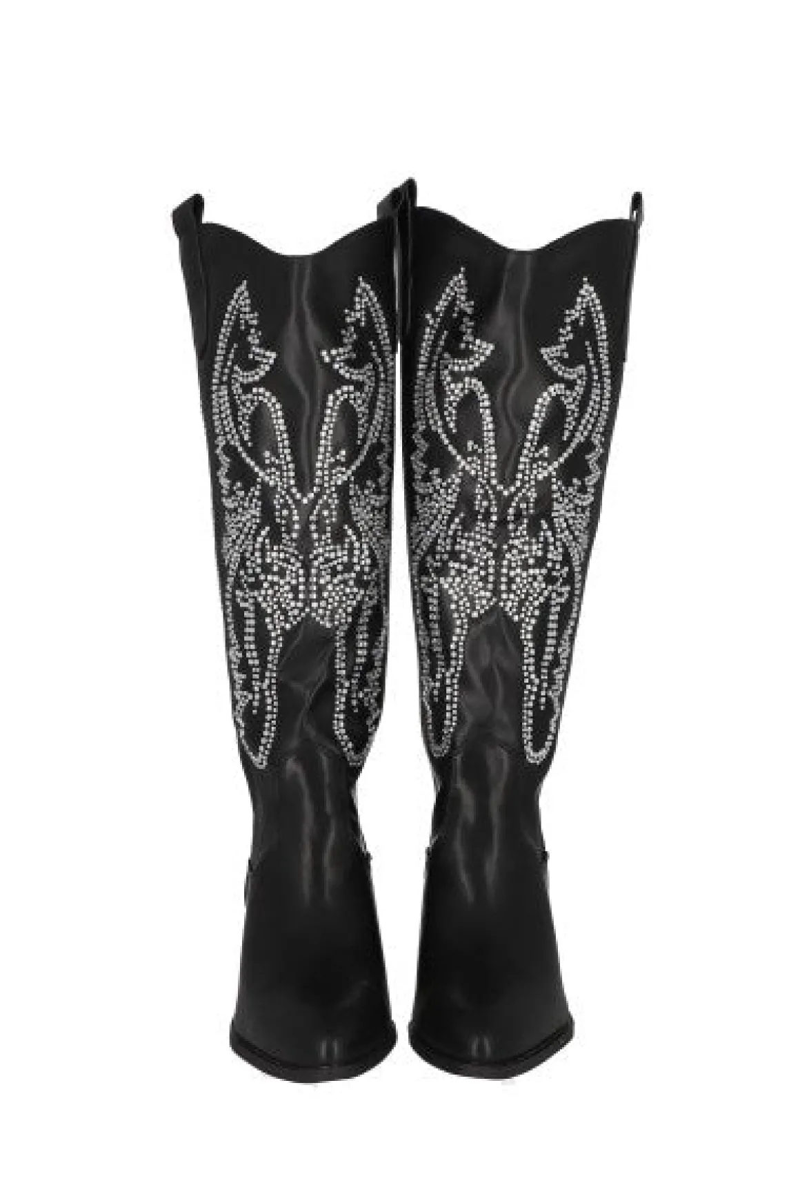 Bota vaquera larga en efecto piel con aplicación de brillos. Frente en punta, tacón ancho bajo, jaladores laterales.