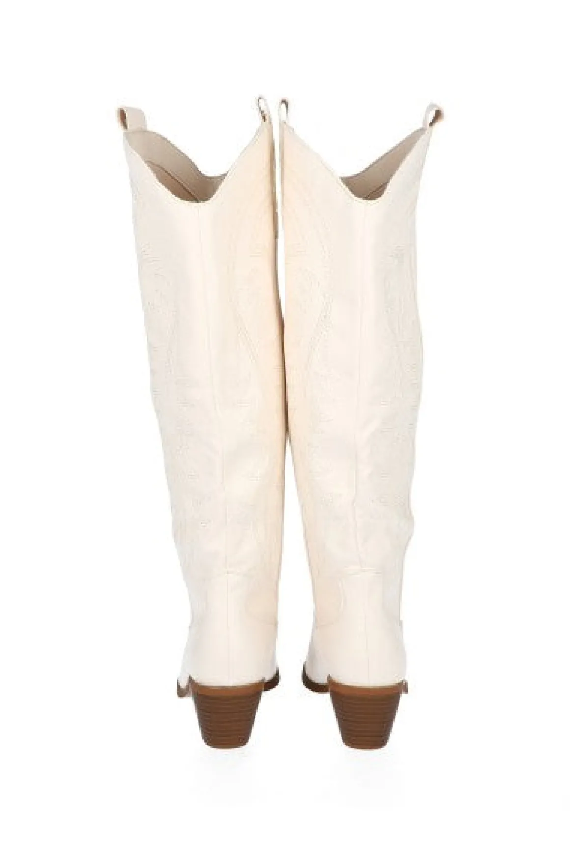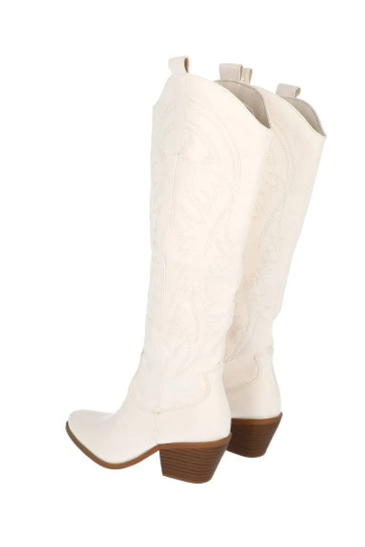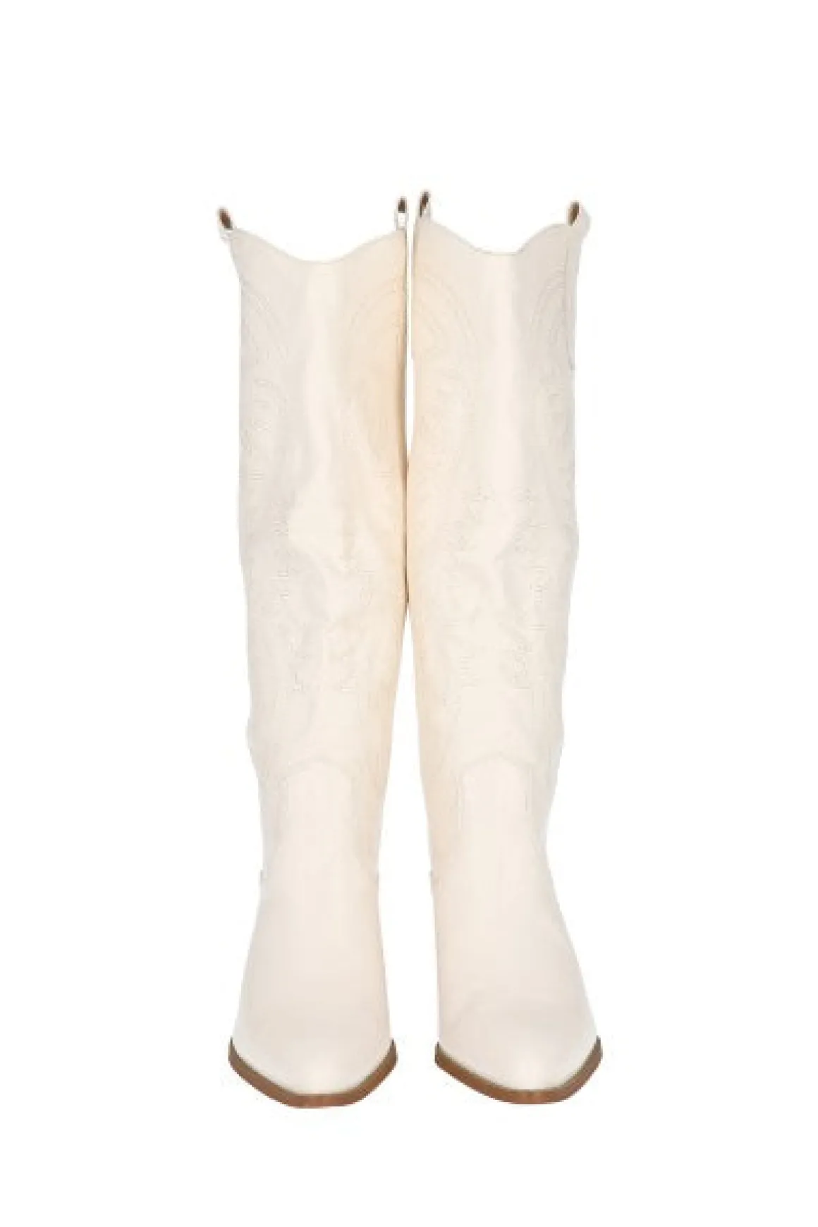 Bota vaquera larga en efecto piel con bordados laterales. Frente en punta, tacón ancho bajo, jaladores laterales.