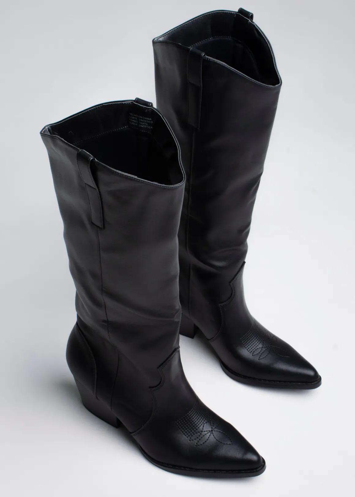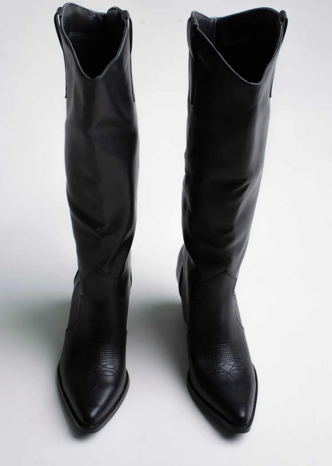 Bota vaquera larga en gamuza con tacón pequeño grueso. Diseño puntiagudo y tiradores laterales.