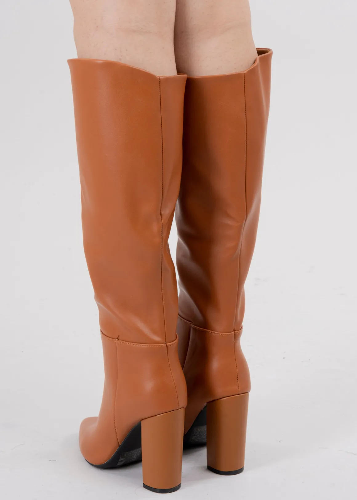 Botas largas de efecto piel. Diseño puntal con tacón alto grueso. Con costuras frontales.