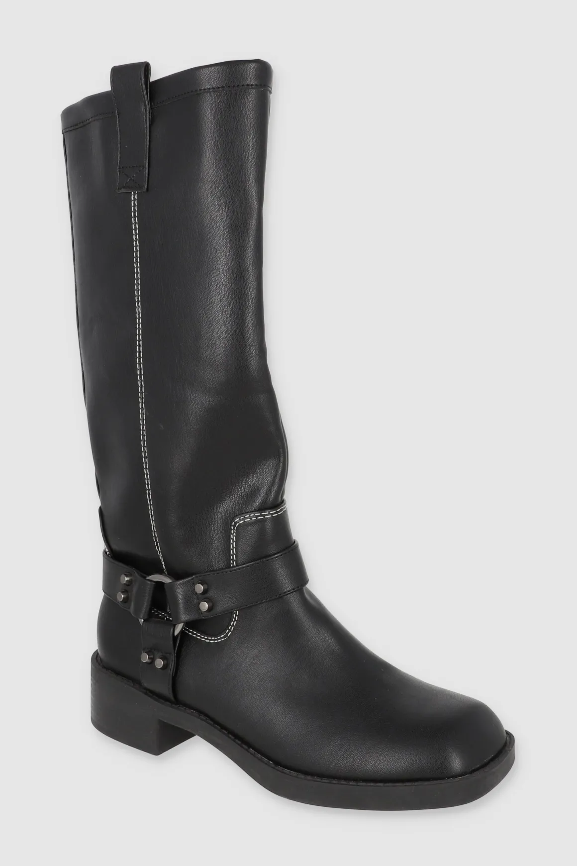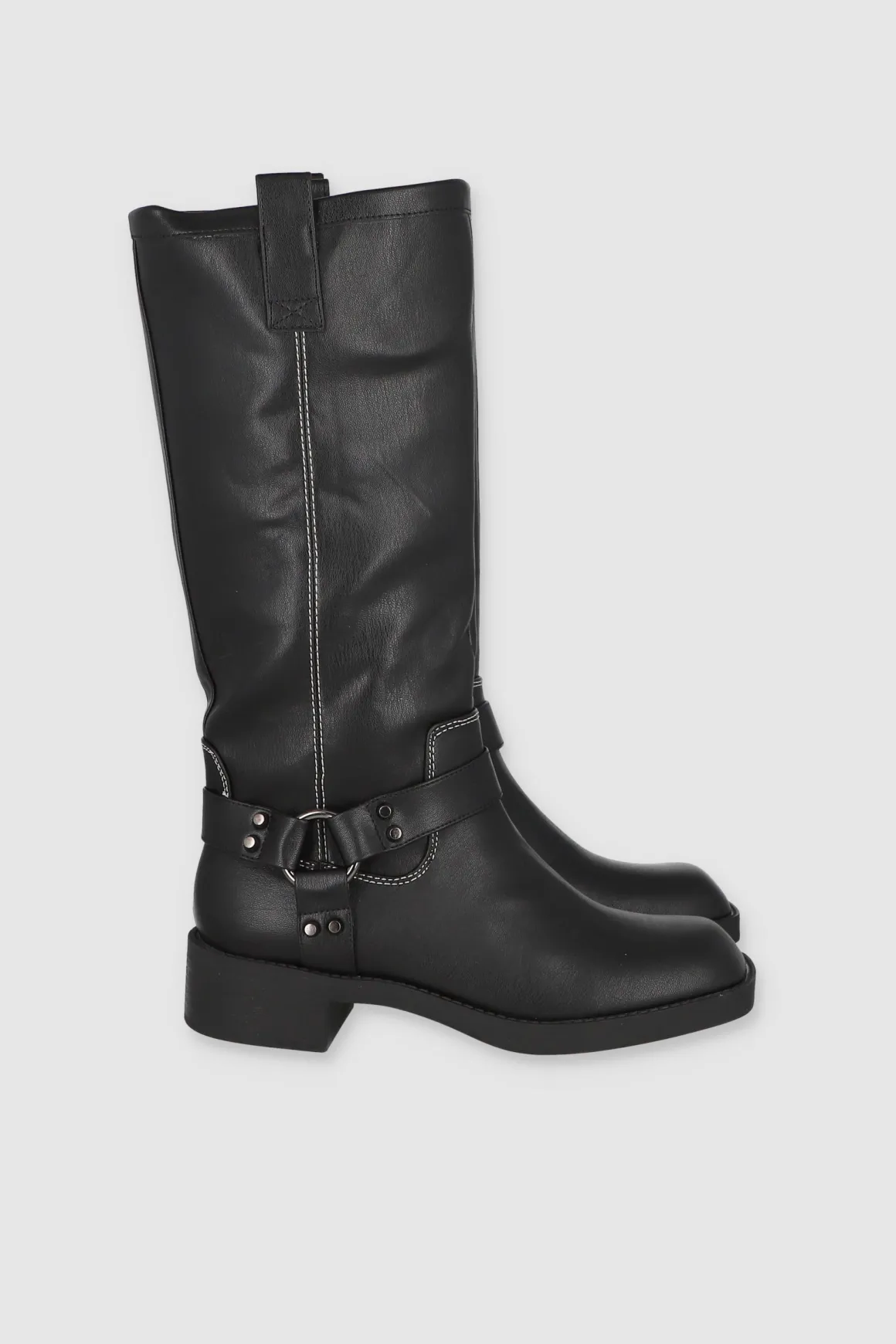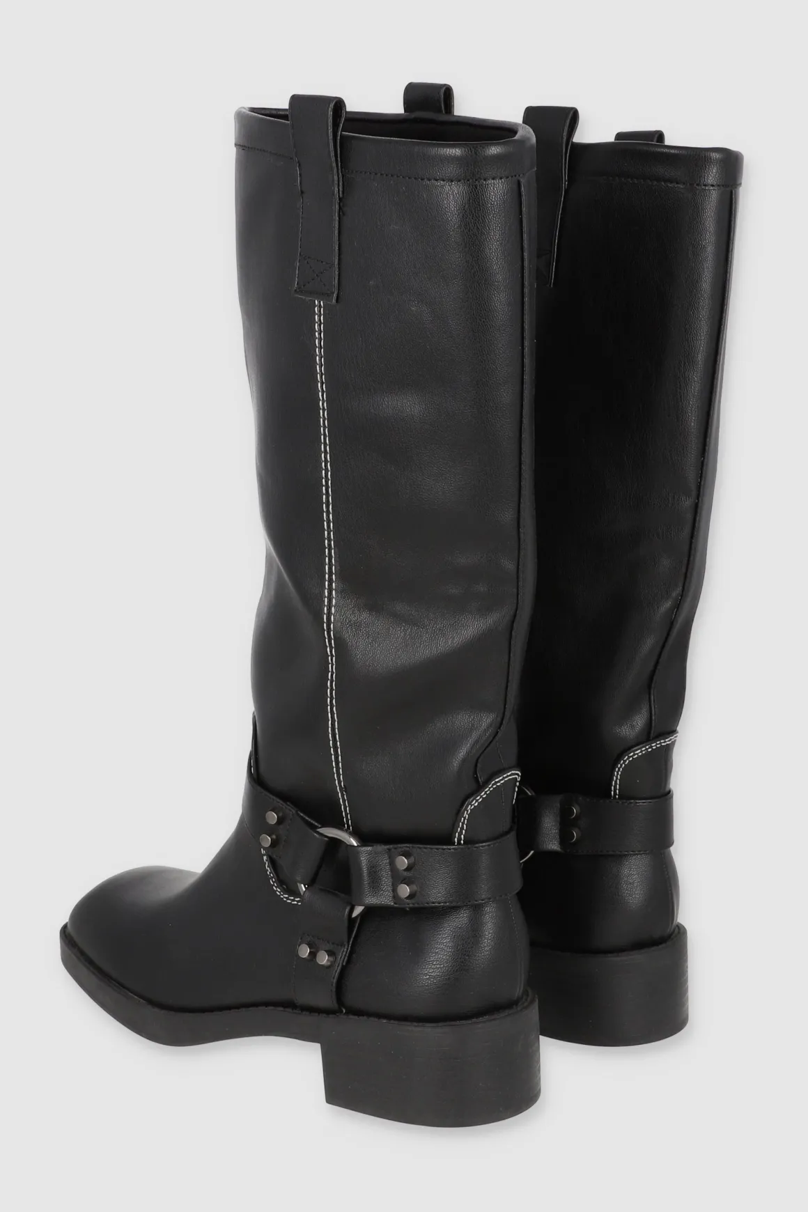 Estas botas motero largas de efecto piel son el complemento perfecto para tu estilo. Con un ligero tacón que brinda comodidad y estilo, las tiras con hebilla redonda y estoperoles le dan un toque distintivo a tu outfit. Además, los tiradores laterales facilitan su colocación, haciéndolas ideales para el uso diario o para lucir un look audaz en eventos.
