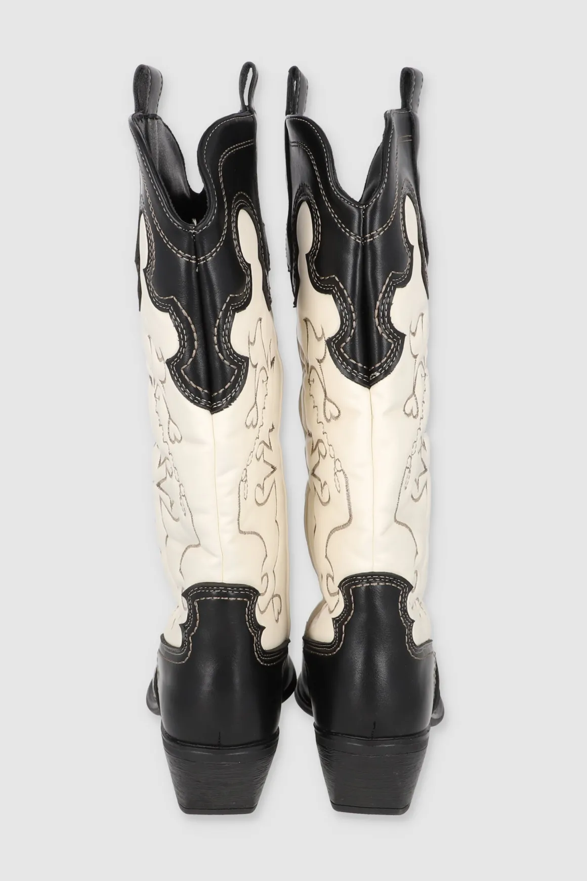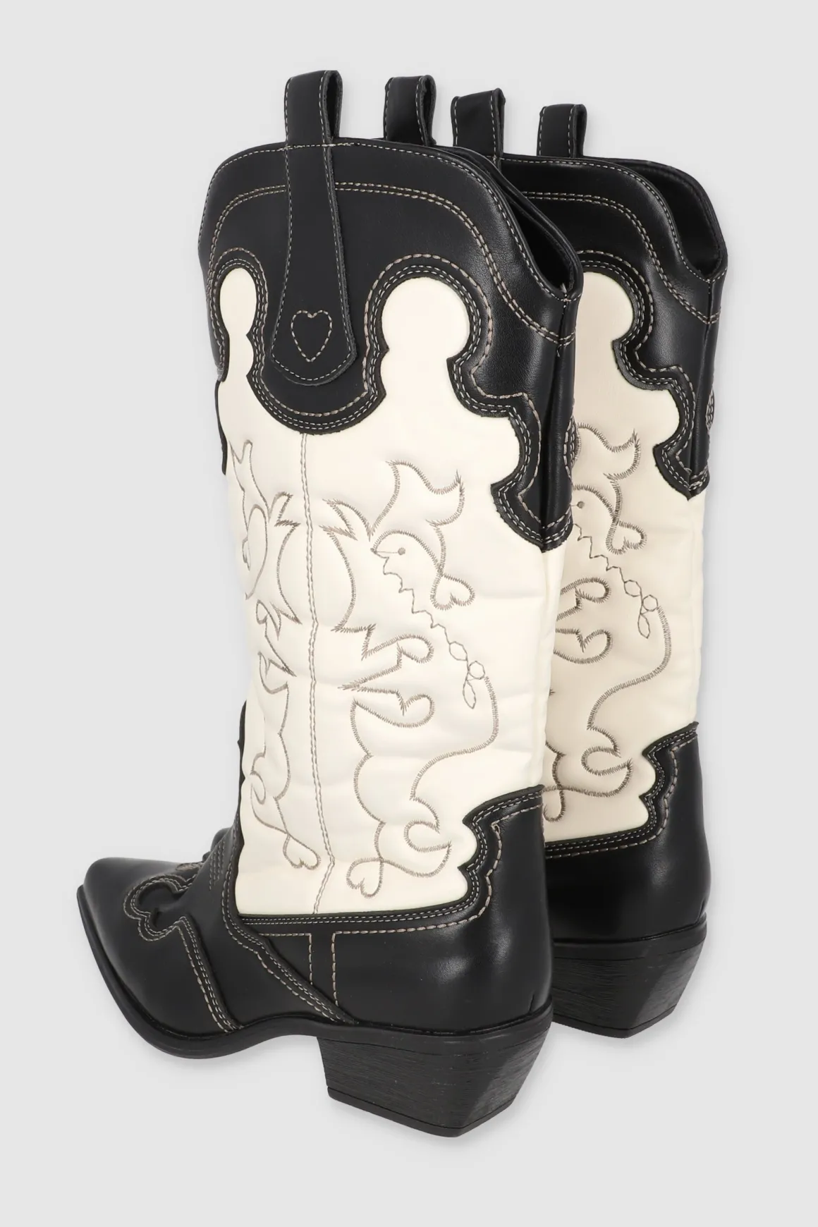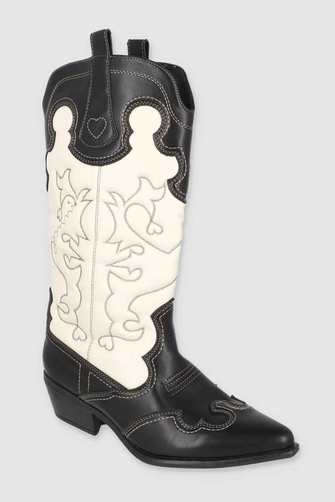 Descubre nuestras botas vaqueras largas de efecto piel con tacón bloque bajo. Su diseño bicolor con costuras resalta su estilo único. Con tiradores laterales para mayor comodidad, estas botas son perfectas para añadir un toque de estilo a tus conjuntos.
