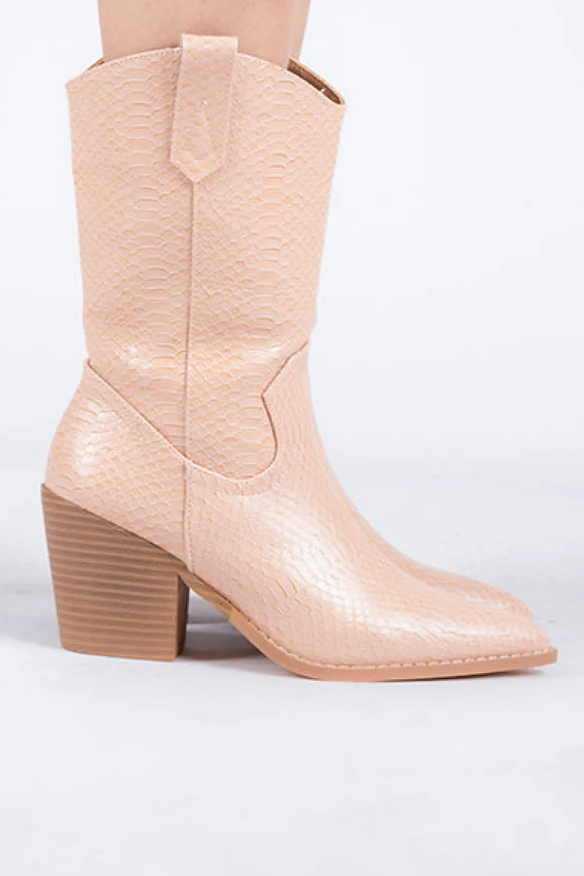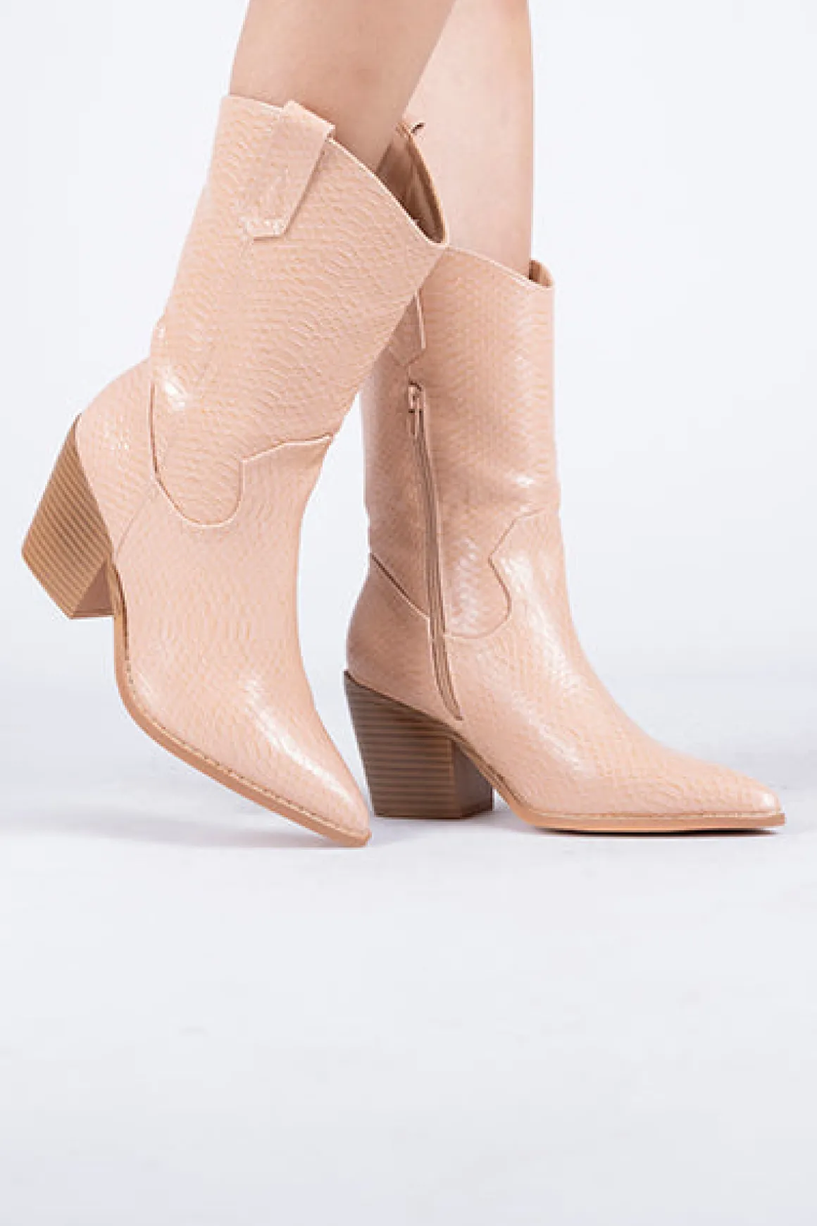 Botas vaqueras con textura y diseño puntal con tacón ancho. Tirador en la parte trasera. Detalles de tacón: Alto 8.7cm x Ancho 5cm.