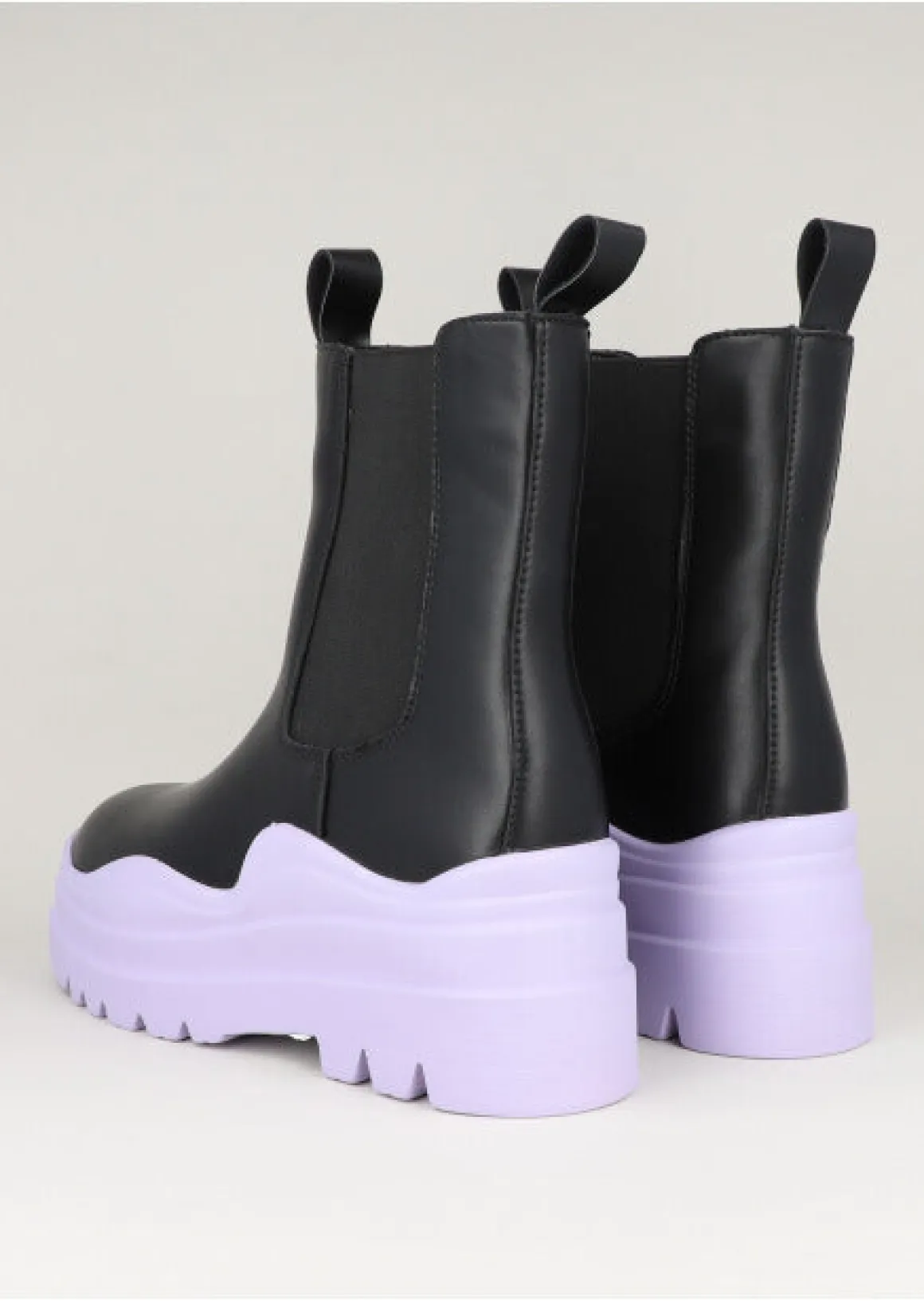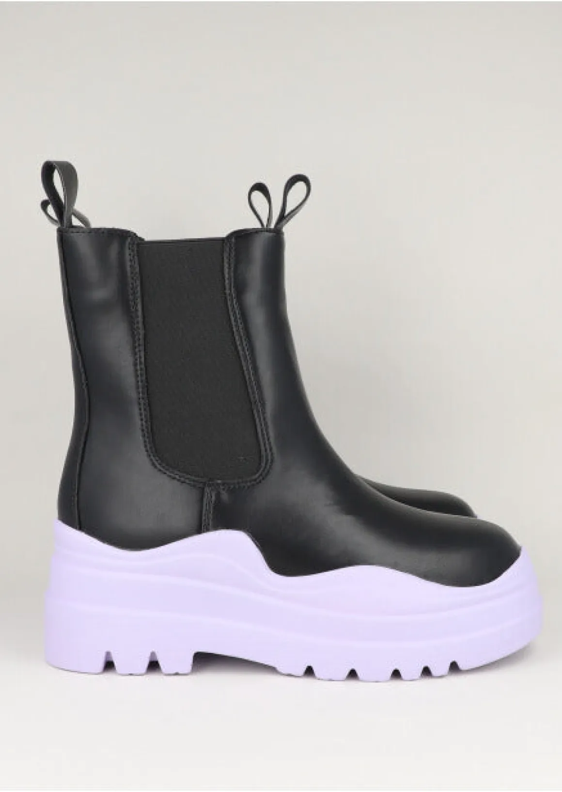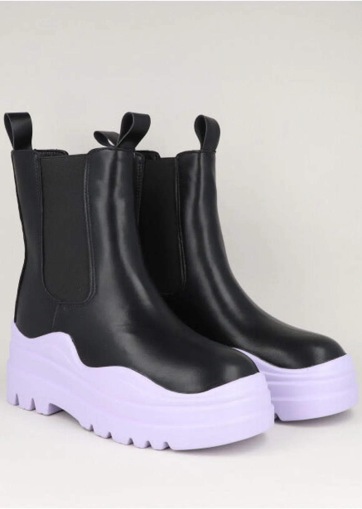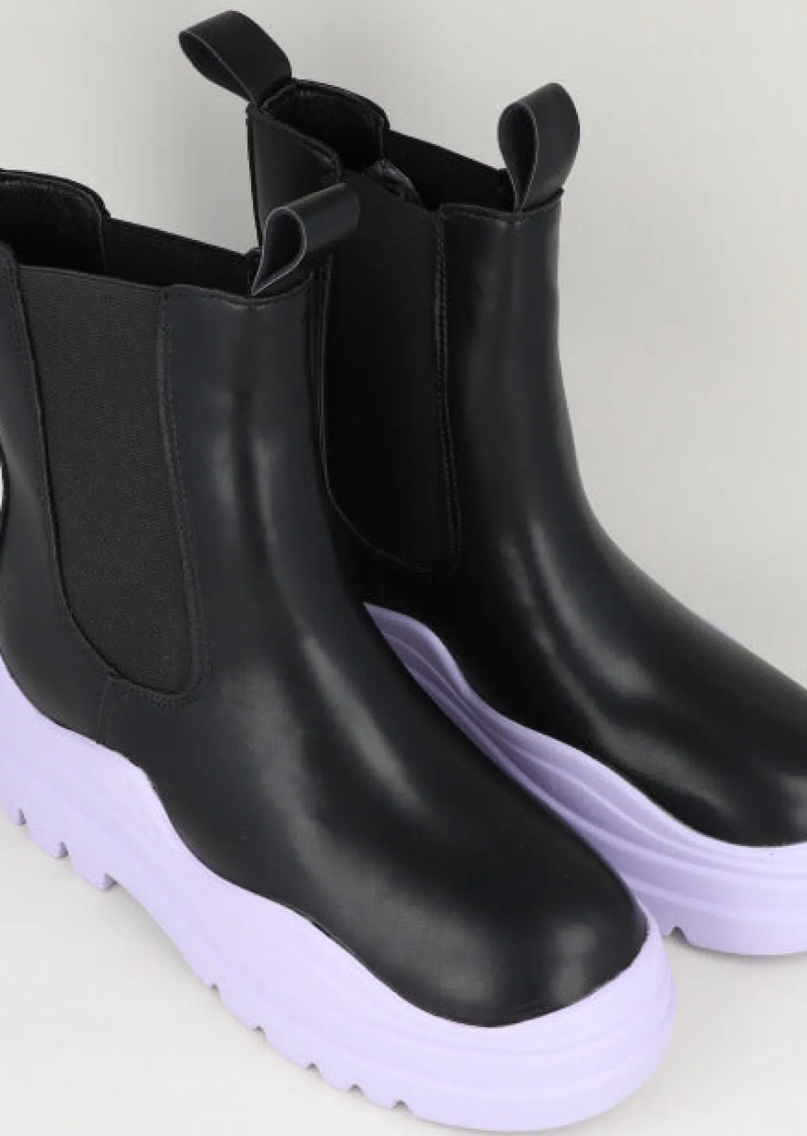 Botín midi chelsea de efecto piel. Suela alta con diseño de ondas en color. Elástico stretch en laterales. Con doble tirador.