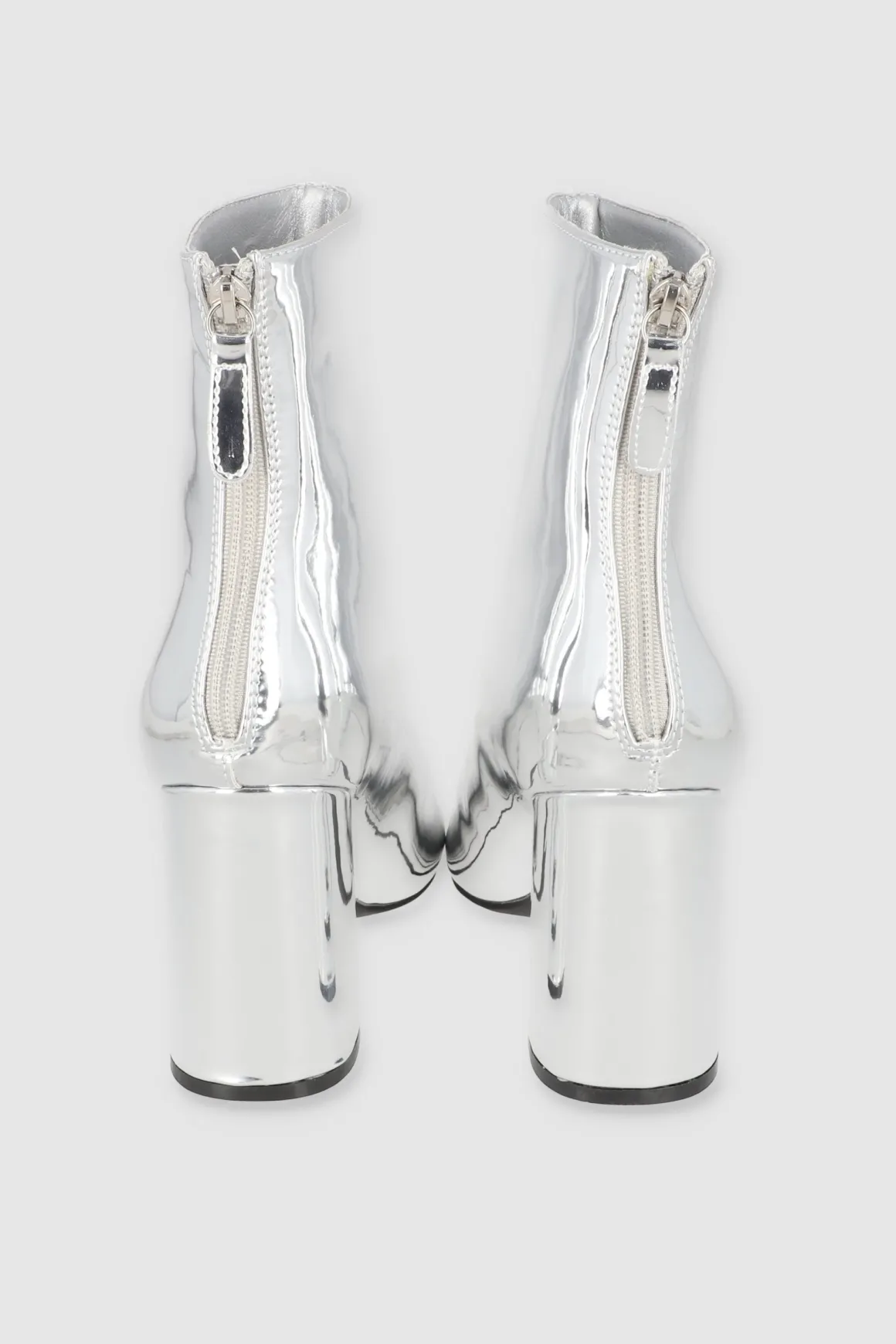 Añade brillo a tu outfit con estos botines en efecto metálico. El tacón ancho y el cierre trasero aseguran estilo y comodidad.