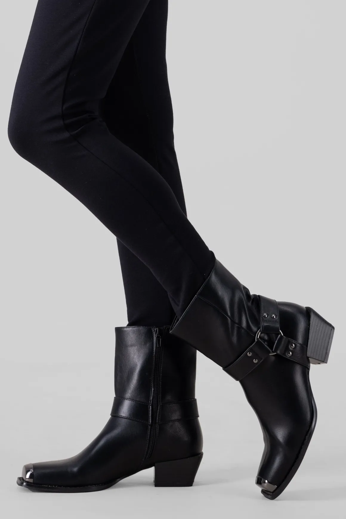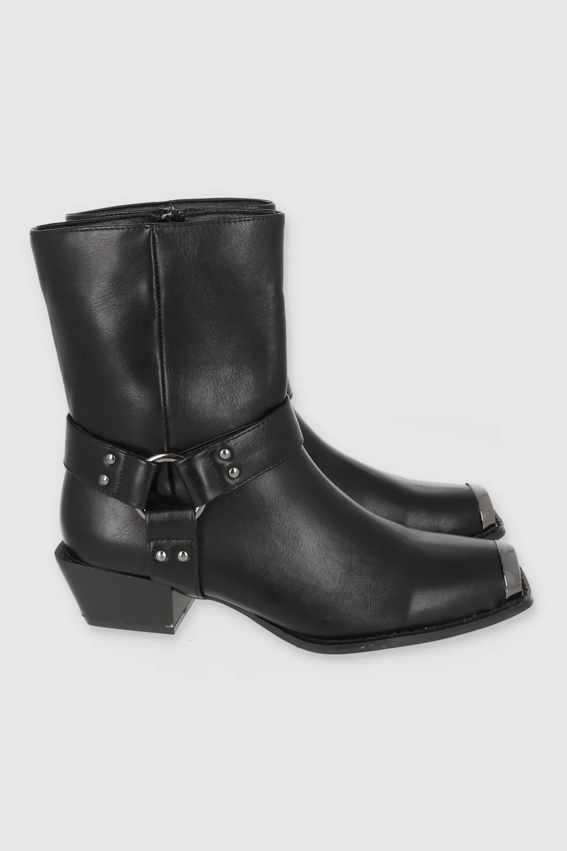 Estos botines vaqueros con punta cuadrada metálica son el toque western que necesitas. Las cintas laterales con aro metálico y el tacón ancho bajo le dan un estilo único y moderno. ¡Combínalos con faldas o jeans y dale un toque vaquero a tu outfit!