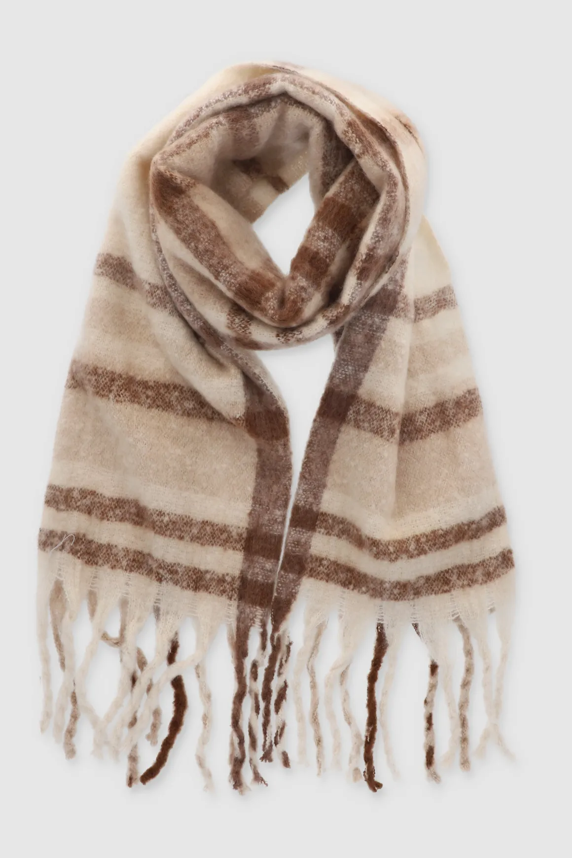 Bufanda en tejido suave con diseño de cuadros y flecos.