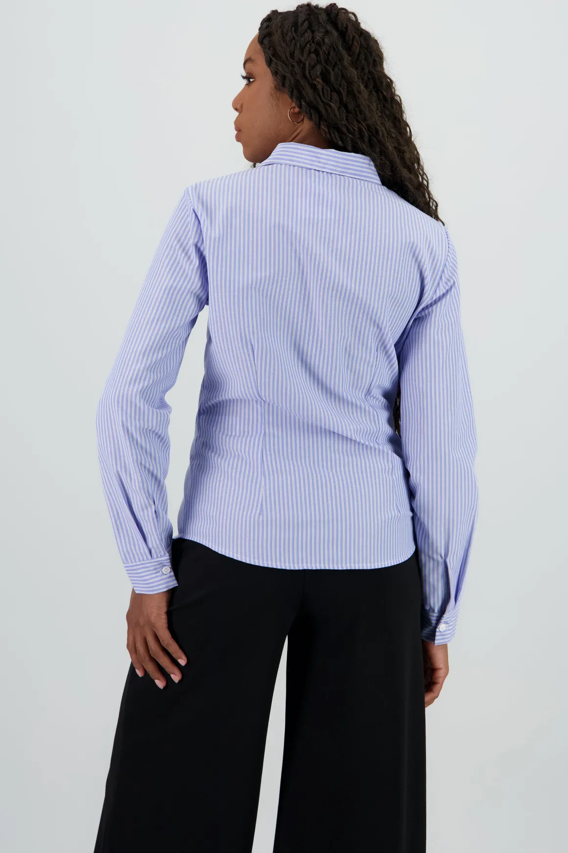 Camisa básica de rayas, con corte recto y cuello clásico.