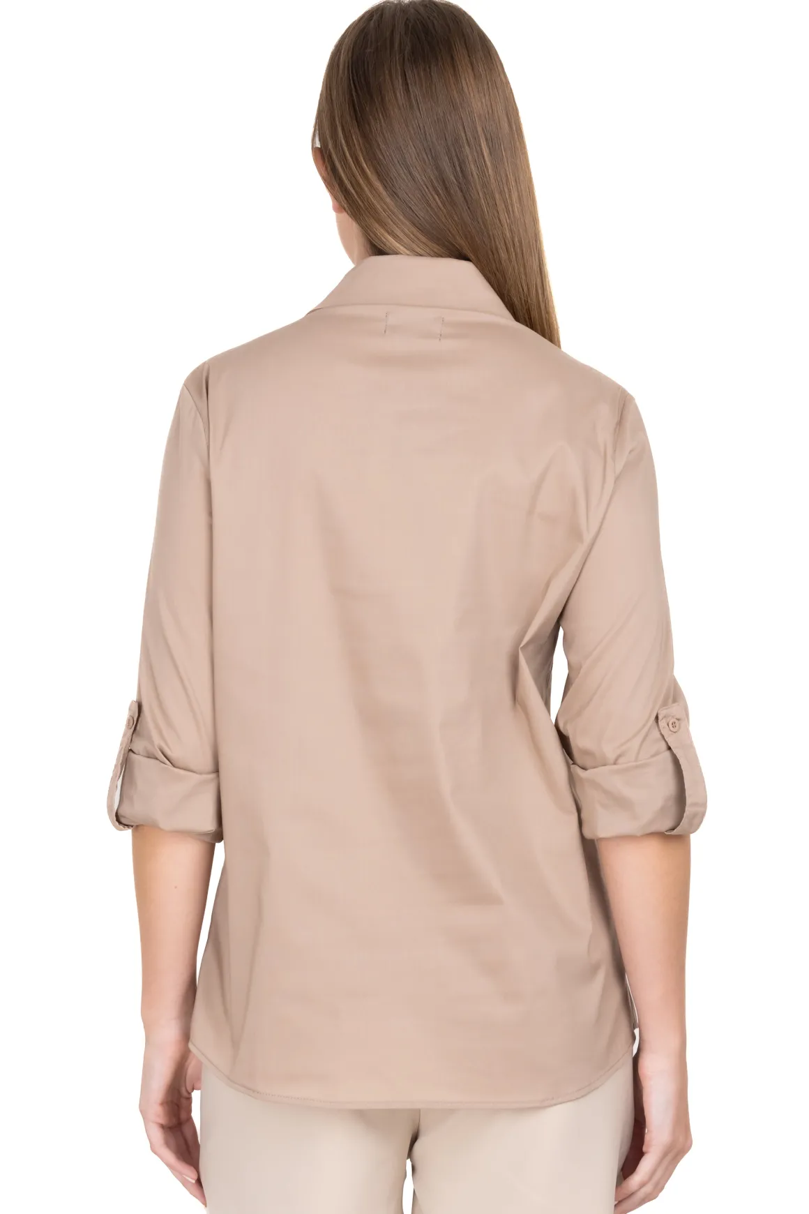 Camisa cargo con solapa en cuello, bolsillos delanteros y elevadores en mangas. Cierre delantero mediante botones combinados a tono. Composición: 95% algodón 5% elastano.