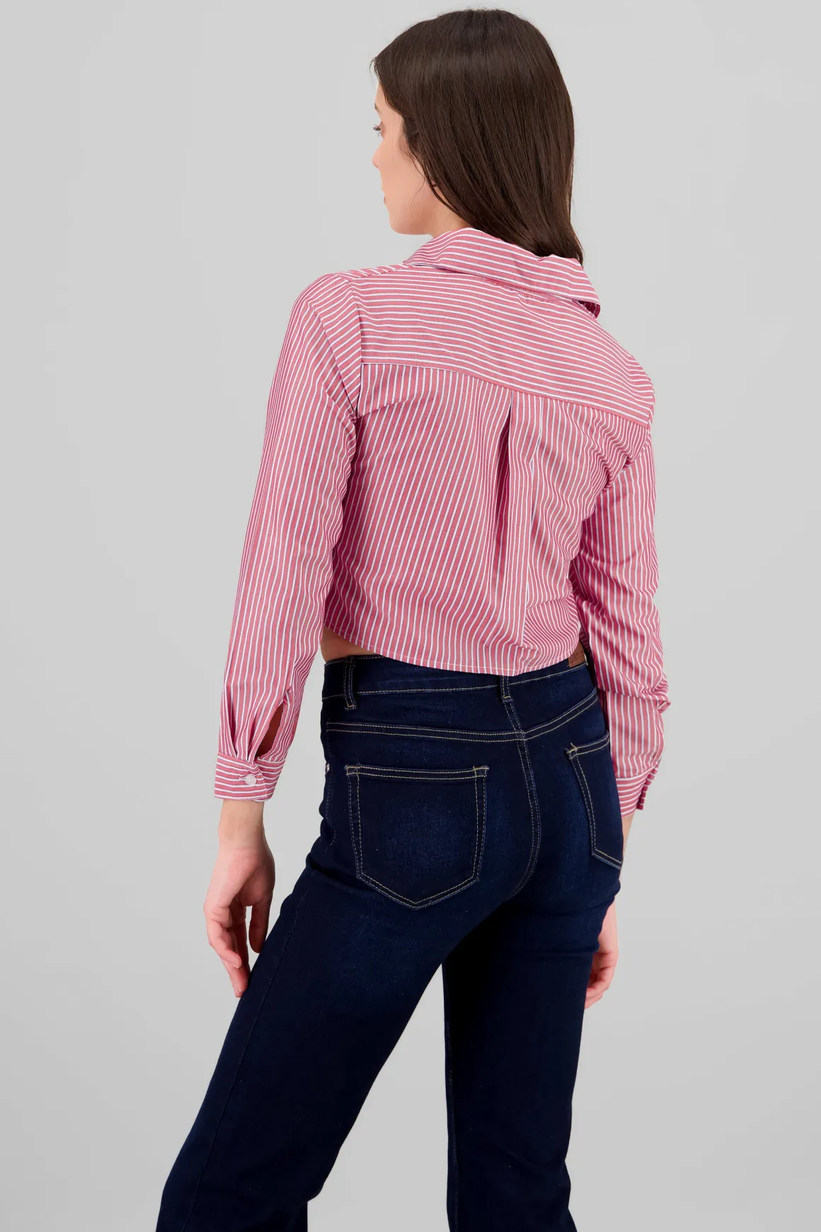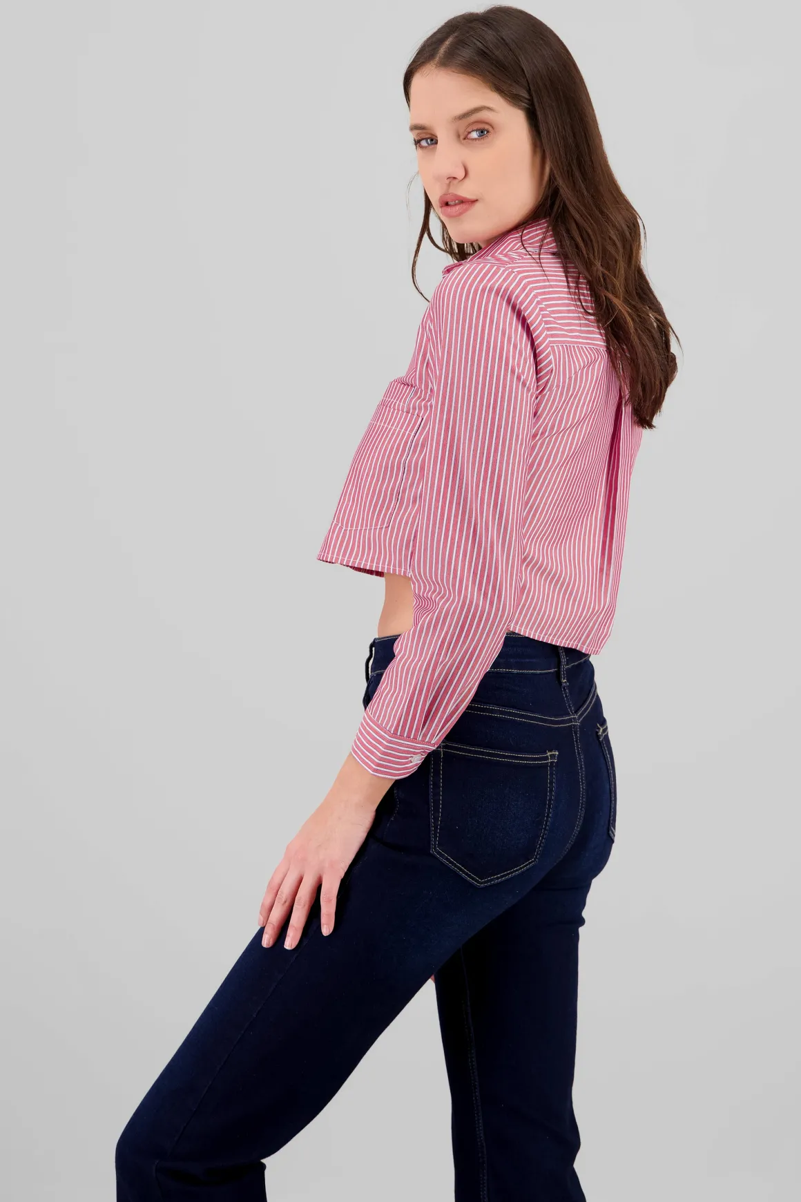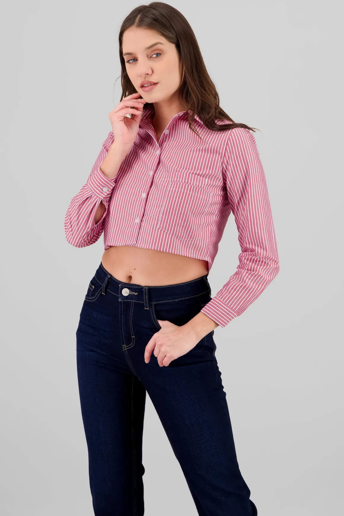 Camisa crop con estampado a rayas y corte boxy que ofrece un estilo moderno y cómodo. Destaca por su cuello tipo solapa, mangas largas y doble bolsillo en la parte frontal, agregando un toque de originalidad a tu look.