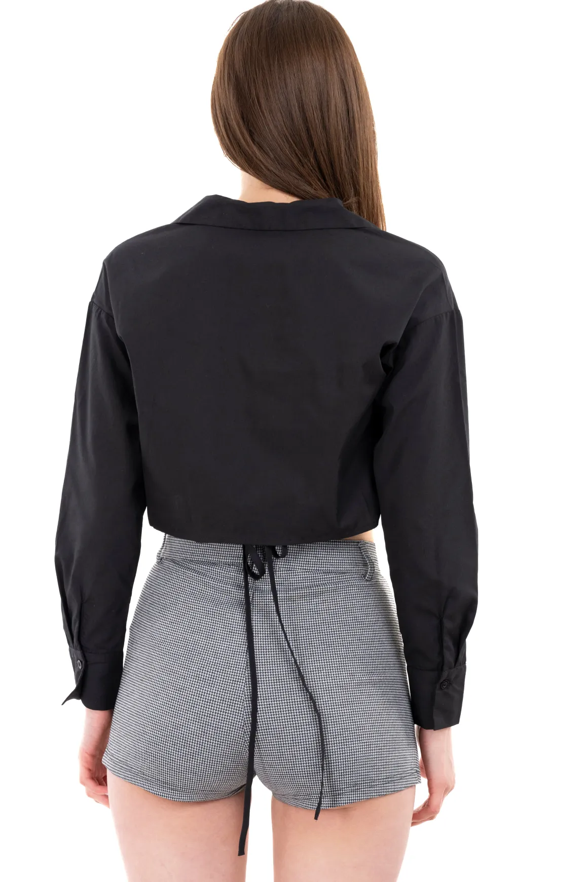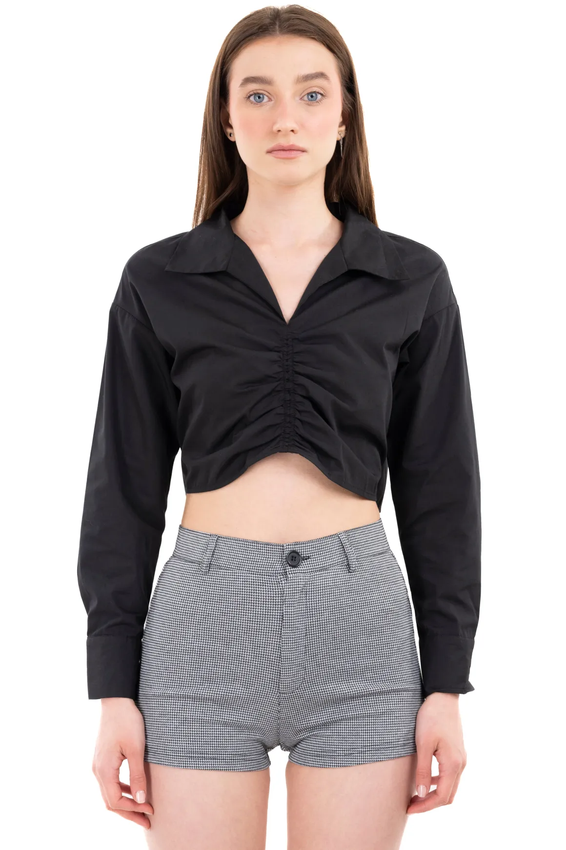 Camisa crop monocolor con fruncido delantero de manga larga y cuello regular.