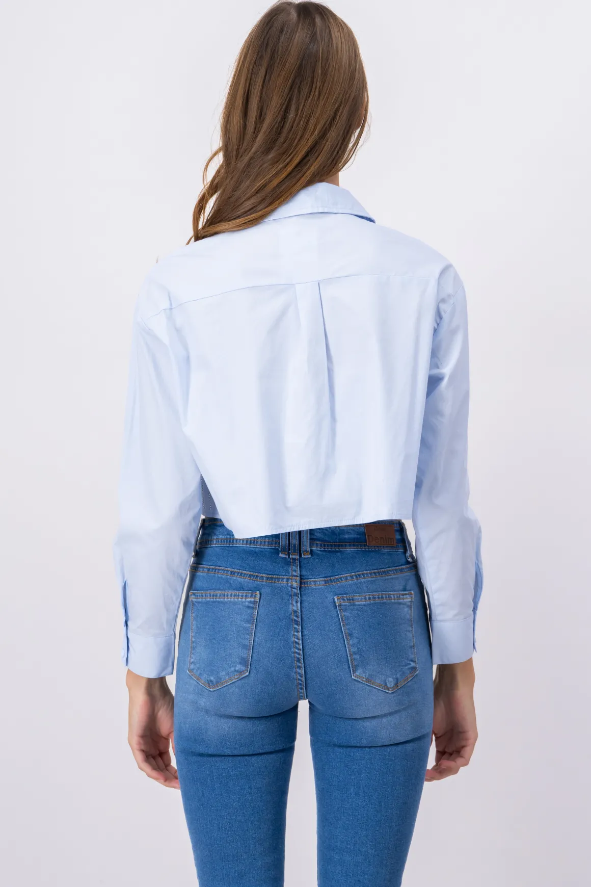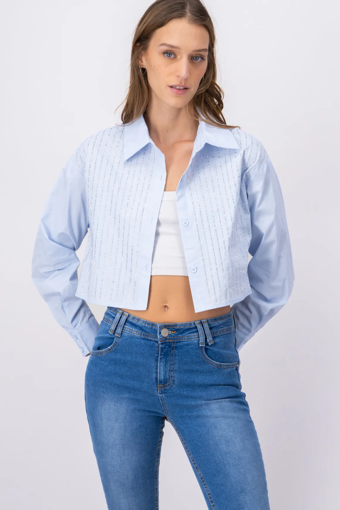 Camisa crop con corte boxy de cuello solapa y manga larga. Diseño con líneas decoradas de pedrería brillosa en parte frontal.