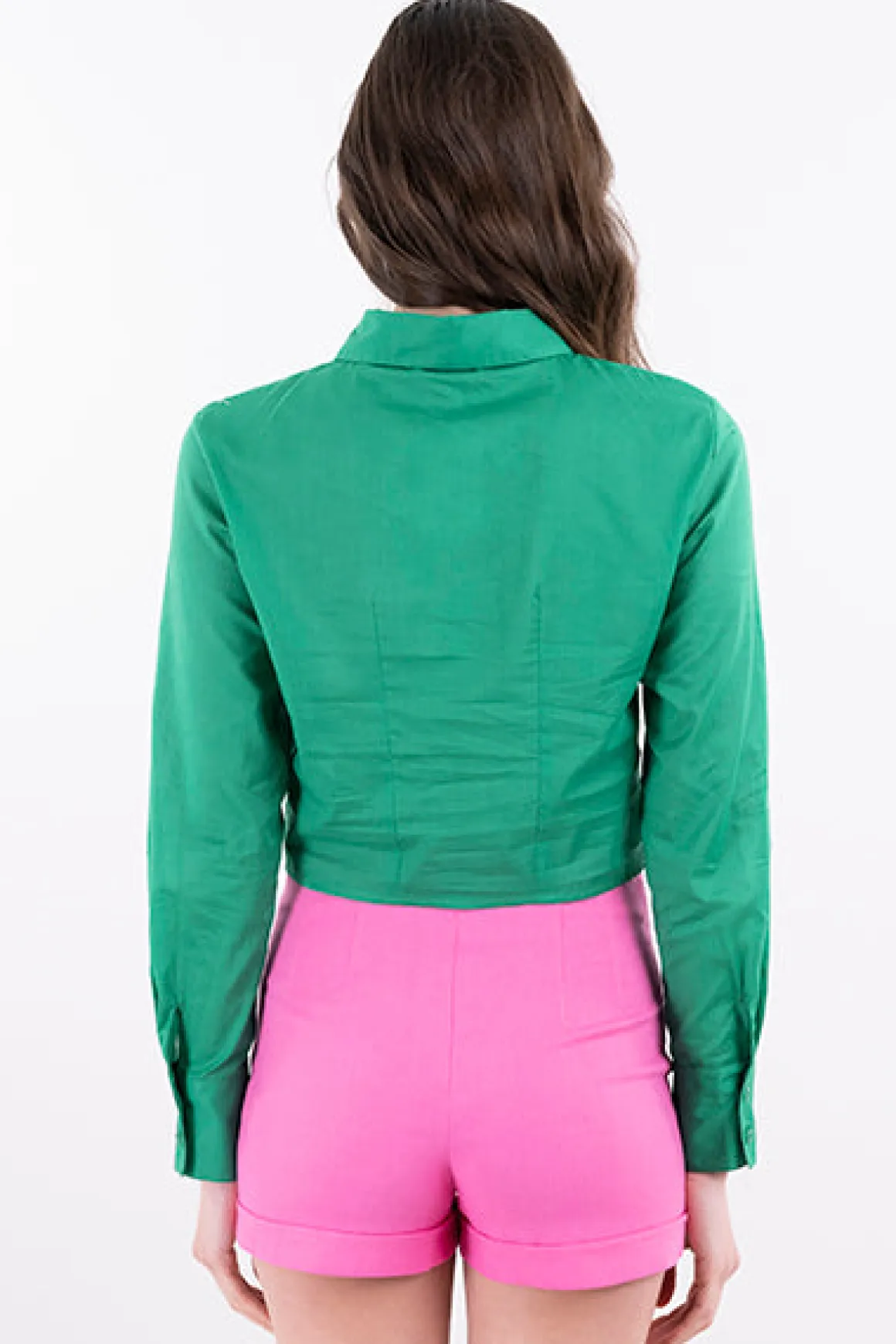 Camisa corta de cuello solapa con pinzas frontales y en espalda. Manga larga con puño ancho y botón. Cierre frontal con botones combinados a tono.