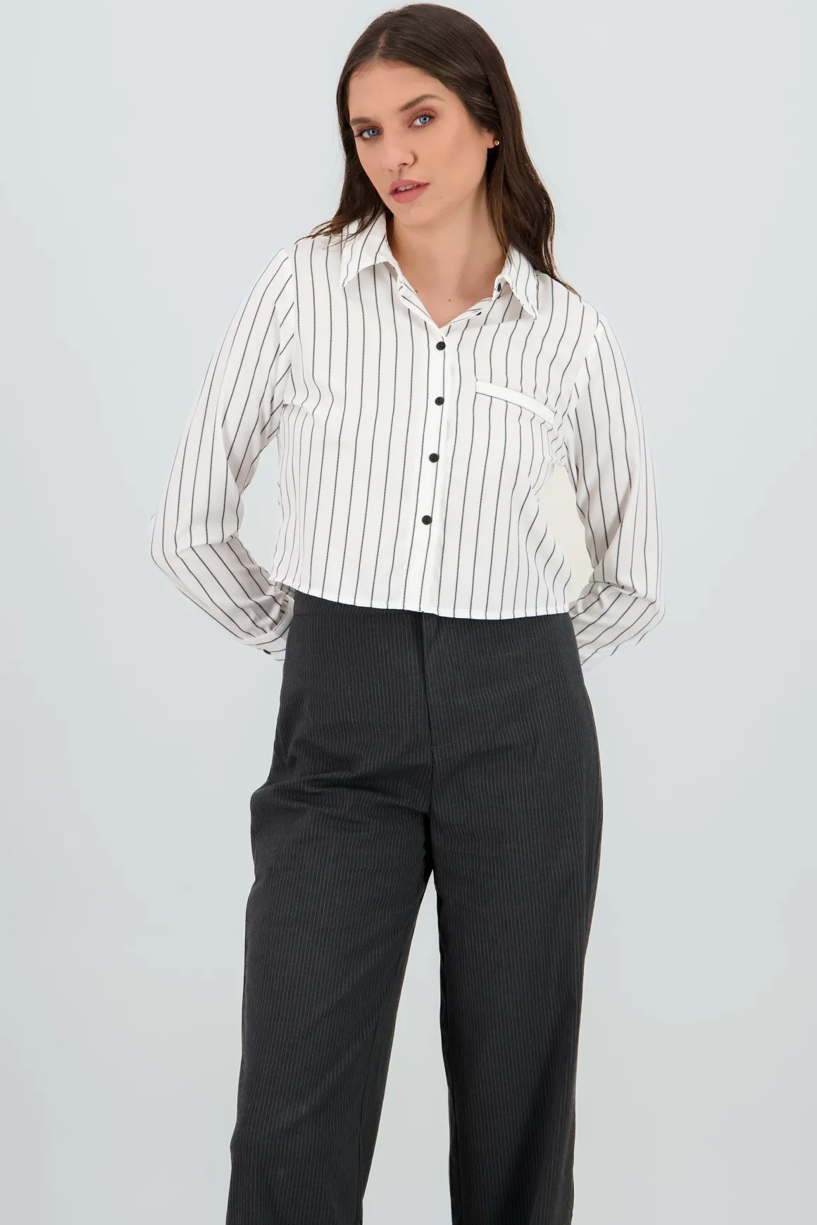 Esta camisa crop es justo lo que necesitas para esos días donde quieres lucir genial sin complicarte. Perfecta para armar looks tanto casuales como un poco más elaborados, se convertirá en tu favorita.