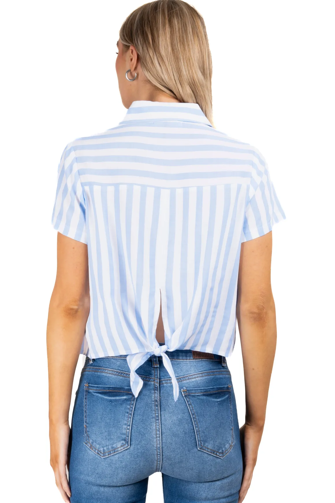 Camisa crop de cuello solapa y manga corta. Diseño de rayas bicolor. Cintas traseras para nudo.
