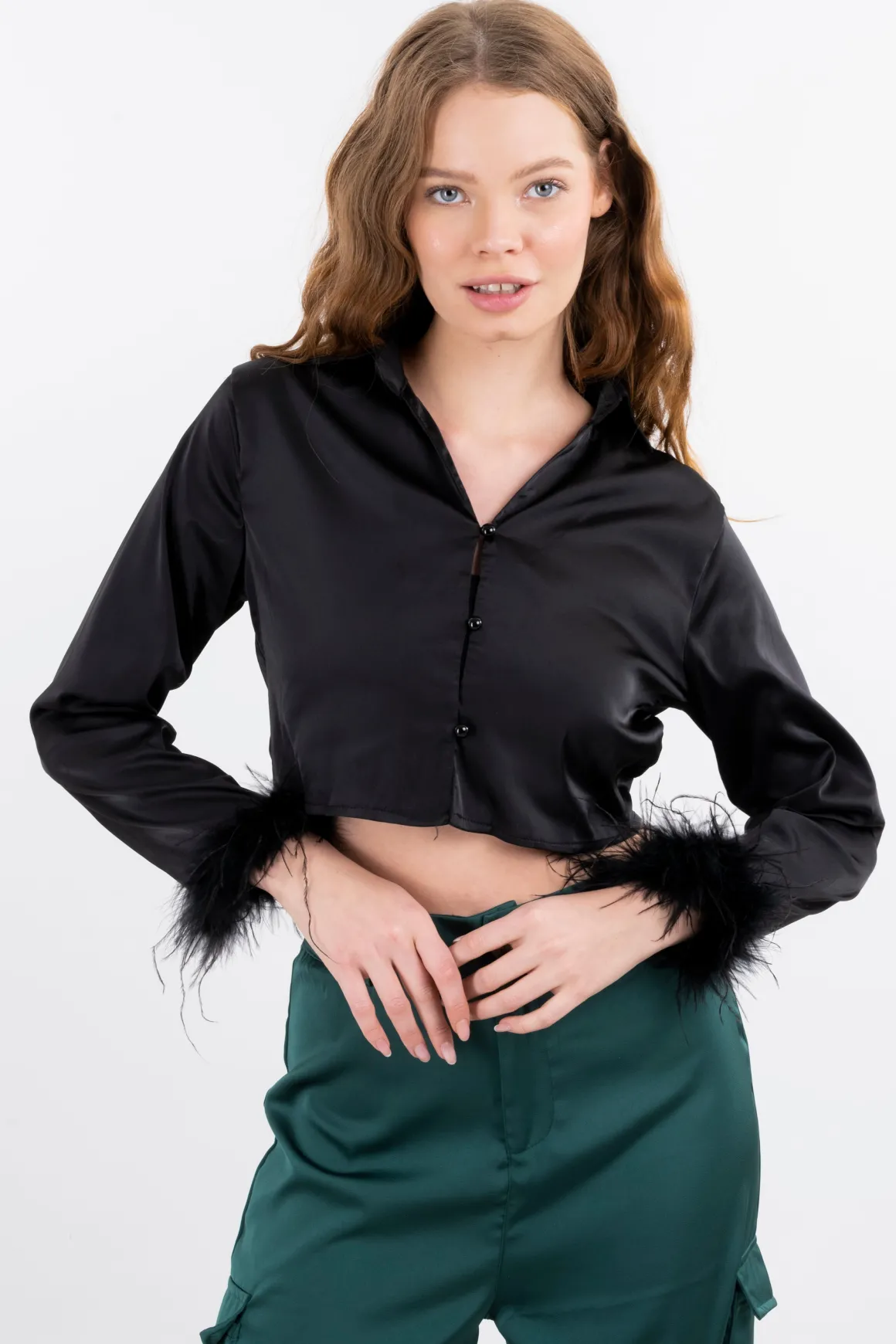 Camisa crop satín de manga larga con plumas. Cierre delantero con botones.